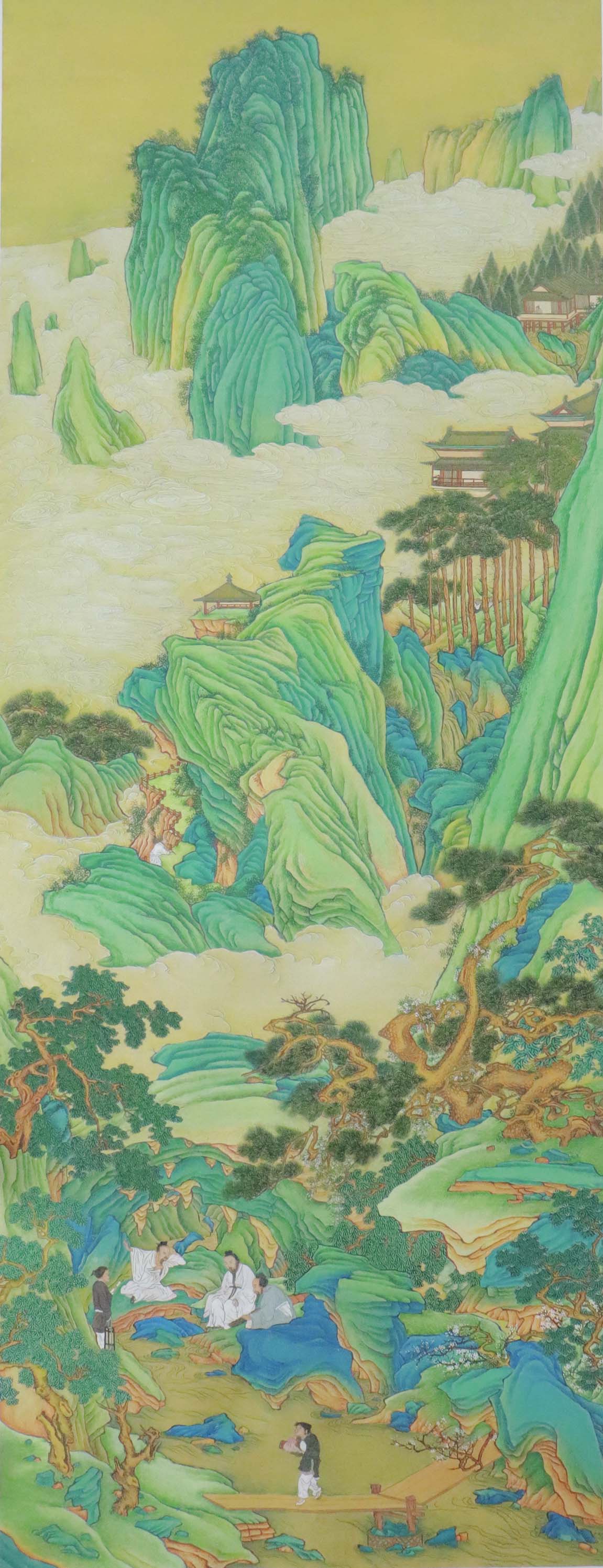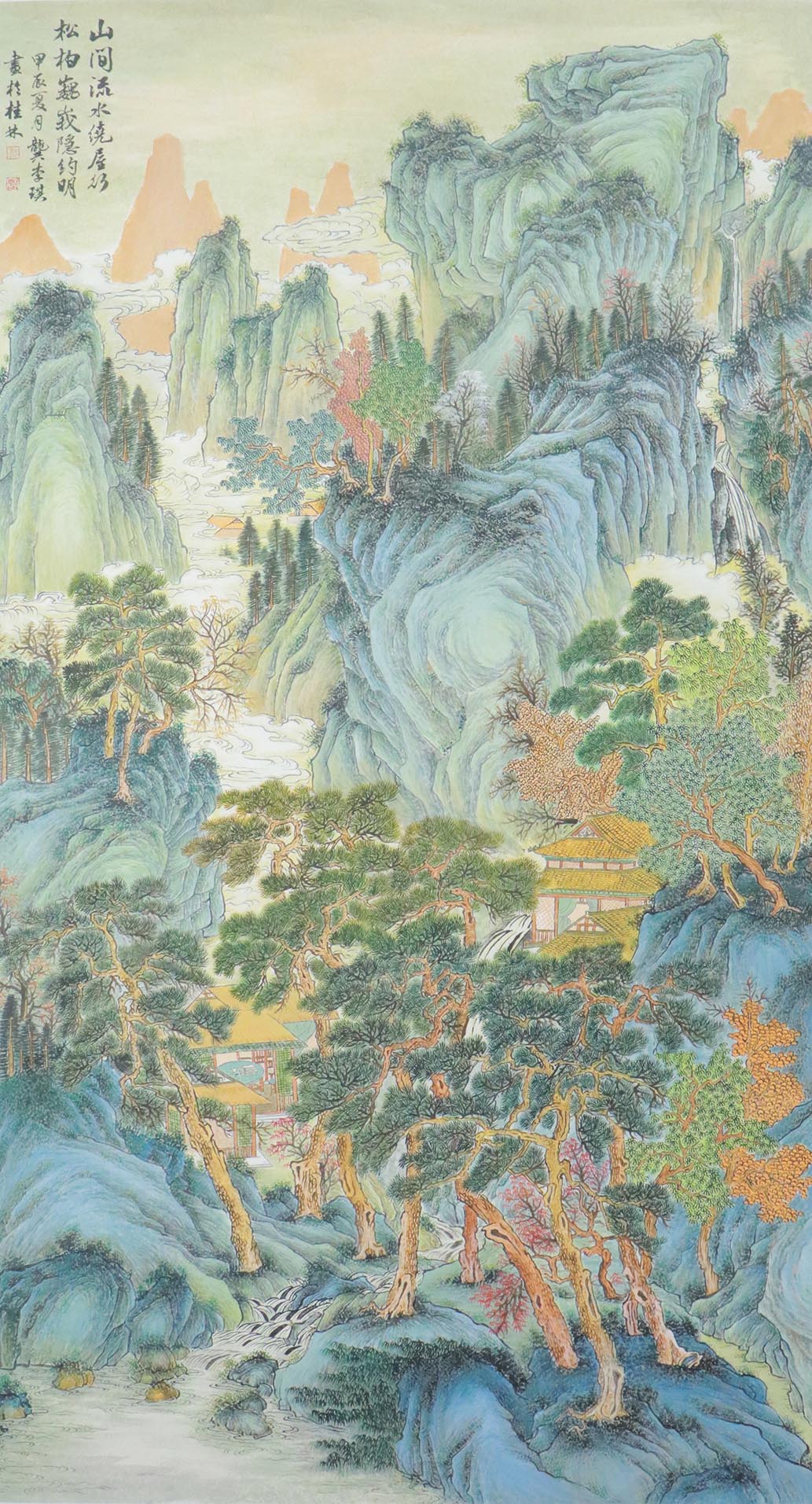 在仿作仇英的《桃源仙境图》时,我选择了矿物颜料重彩的设色方法,希望通过这种传统而又鲜艳的色彩表现手法,能够更好地呈现出原画中那种超凡脱俗的仙境氛围。