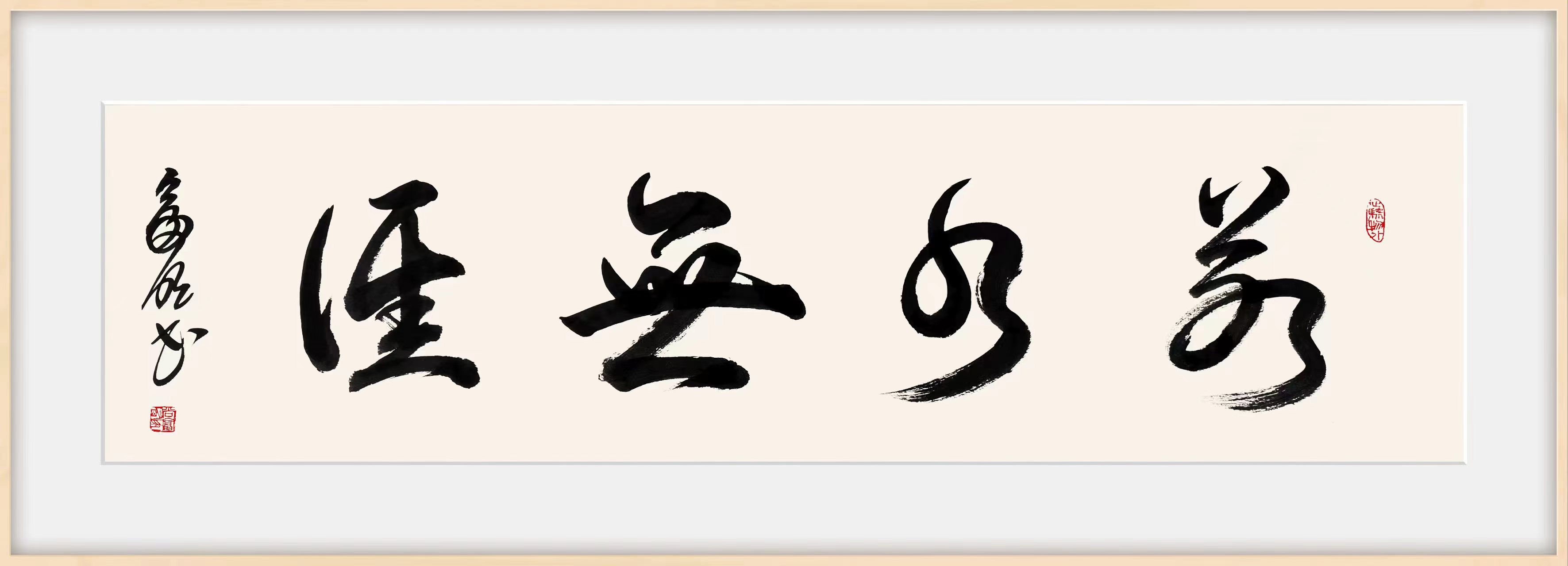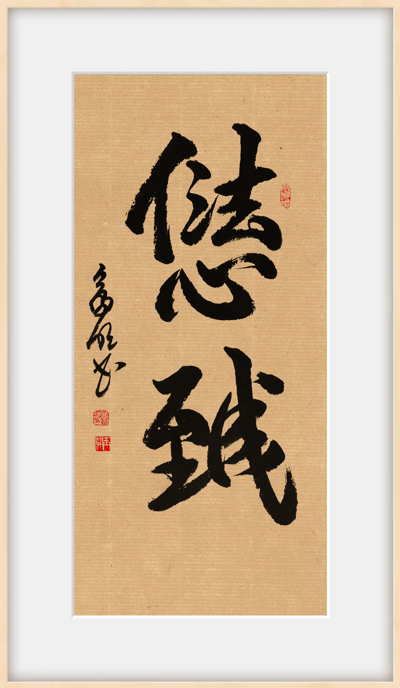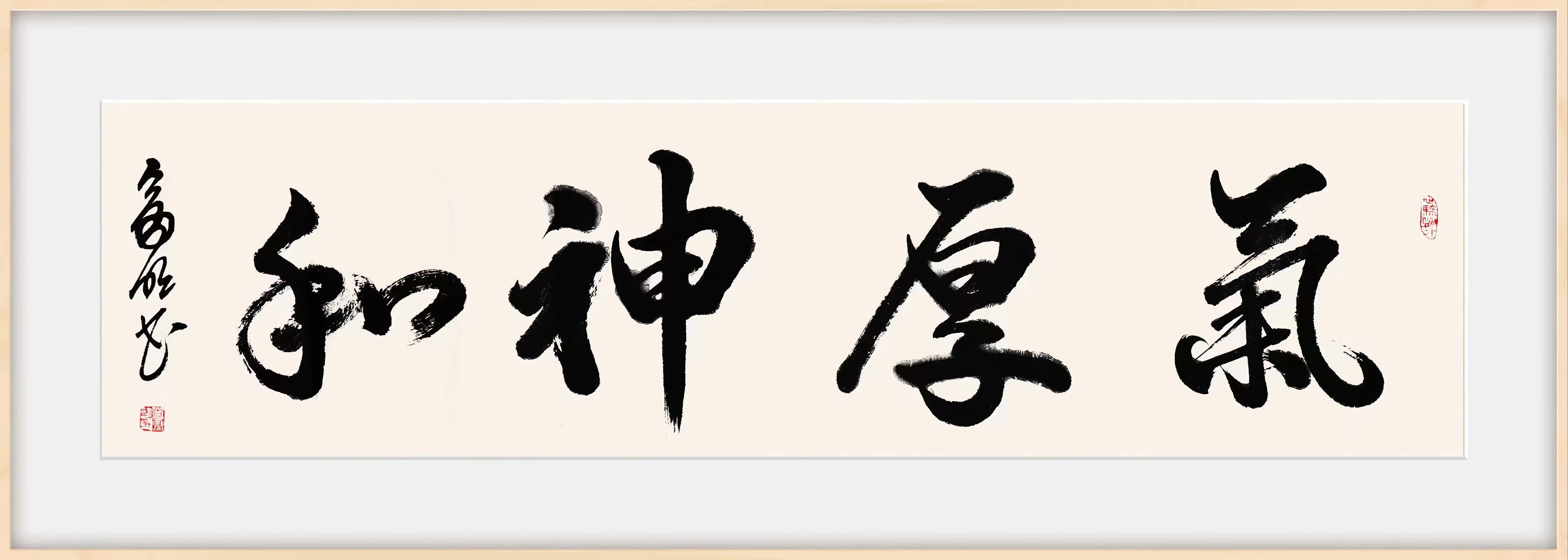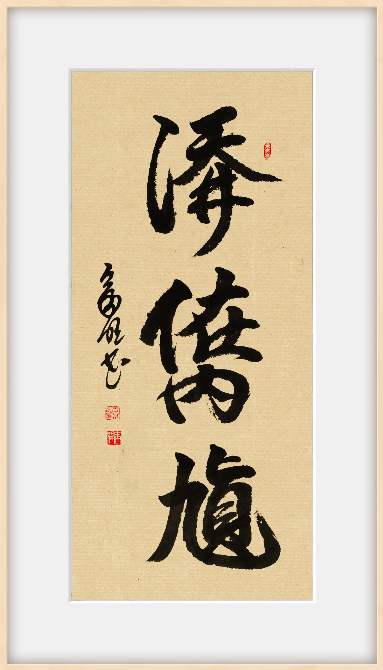 古人挥毫,历来崇尚唯取神,气为佳的习书要妙,此诚如唐人张怀灌于《书艺》一书中所言,是谓且以风神骨气者居上,妍美工用者居下。今观玉开先生之榜书大作,其书功造诣便当属前者之列!众幅榜书,久得二王先贤之根基,又能深悟颜鲁公、苏轼等诸家遗韵,是谓得其笔法而止于摹似,用力到沉着痛快处,方能取古人之神也!提笔浩浩落落,是能在斗笔往来时尽显气势之开合,也能在调和笔墨时彰显播布之研精,险处提飞恰如惊鸾银钩,平处捺满更似劲者武夫,笔笔行云流水,字字更是具有合体之精髓,取其妙意玄机,展现造字智慧,由此纵览之余,诚可谓是书卷气概别出心裁也!