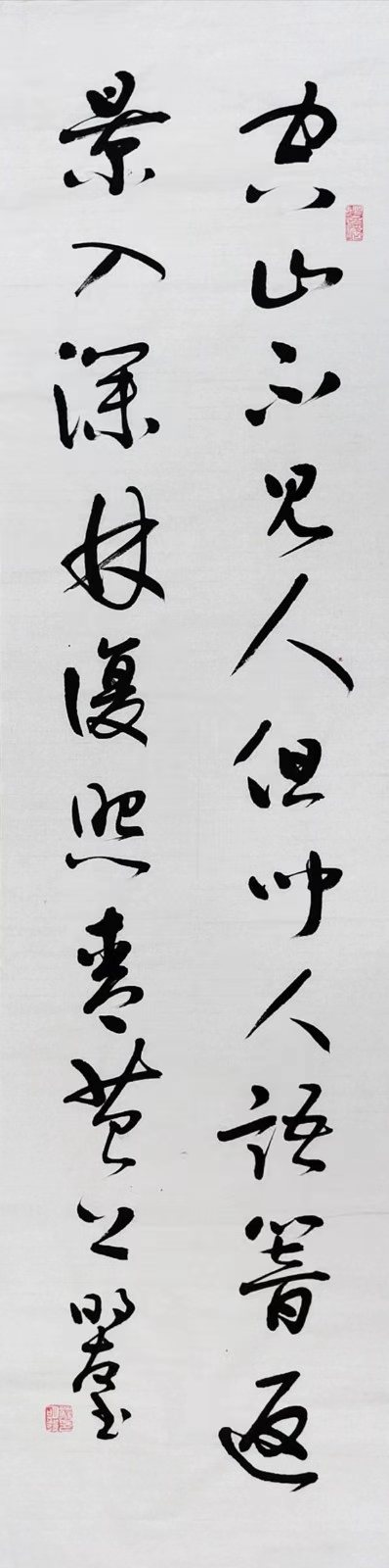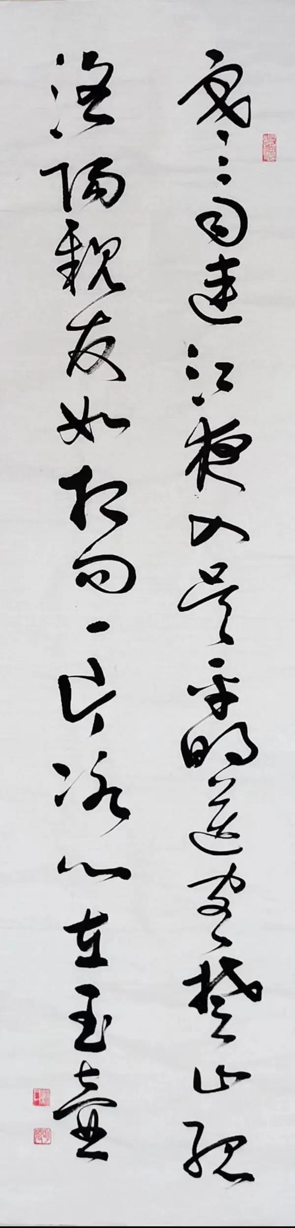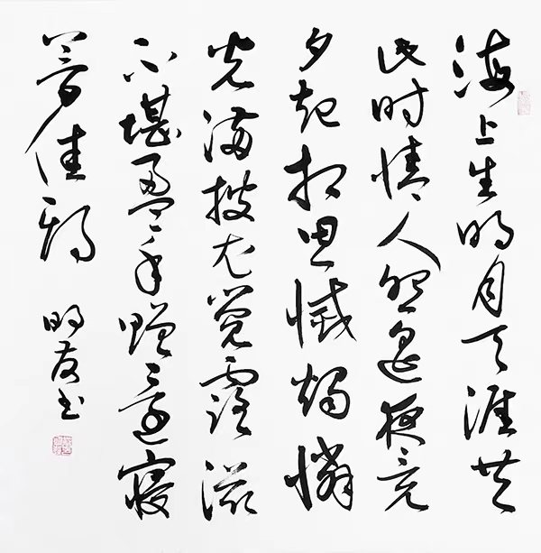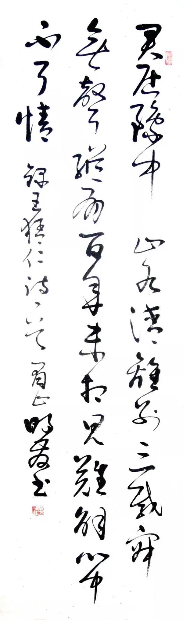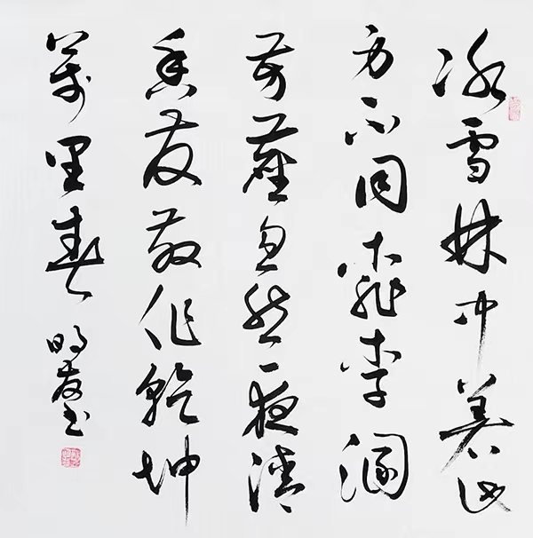 基于上述,欣赏苏明发先生的众幅行草作品,无论是笔墨挥毫的风范,还是诗词豪情的流露,其作品都是能给人带来极强的艺术观赏性。特别是那源自于癫张狂素的纵意情怀,竟是能将行草作品书写得如此铿锵有力!令人不由得感叹,至若磔髦竦骨,短截长,有似夫忠臣抗直补过匡主之节也!用笔只见龙蛇走,字字风神见骨气,旋折进退,笔随意发,可于联络处见章法,更能于洒落处见意境。所谓精神能冲其中,气韵目晕于外,便正如对苏明发先生众幅行草书作的最好诠释!