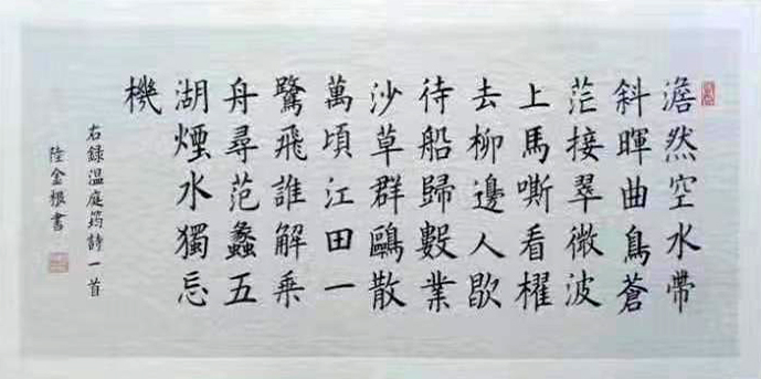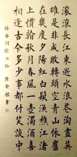 陆金根,男,汉族,愚石斋主,1959年生于上海。现为中国书法家协会会员、中国硬笔书法协会会员、上海徐汇区书画协会会员、上海市赵朴初研究会会员、上海市浦东新区书画研究会会员、华师大孟海印社理事、浙江省江南水墨书画协会会员、浙江省江南水墨书画院特聘书画家。书法初学汉隶诸法体,后攻欧楷;篆刻师法陈巨来先生。书法篆刻受到著名书画家吴长邺先生的指导教诲,吴老这其作品题词钤印。作品多次入奖,并散见于《新民晚报》、《劳动报》《上海老年报》等报刊,获得“中国实力派书画家”、“一级篆刻师”称号,作品被巴金文学研究会、江苏省净土寺、浙江雪窦寺、上海真如寺等收藏。