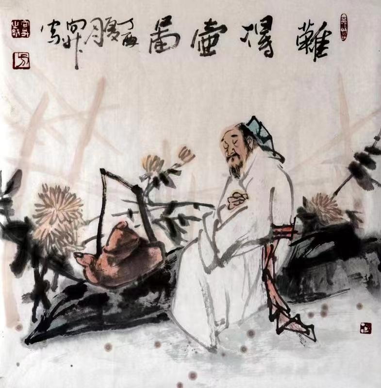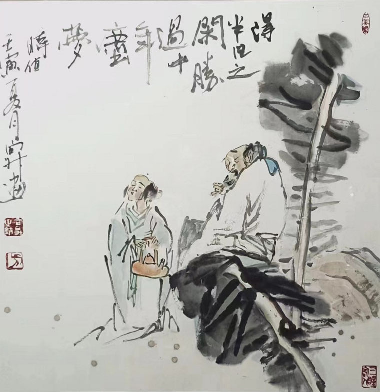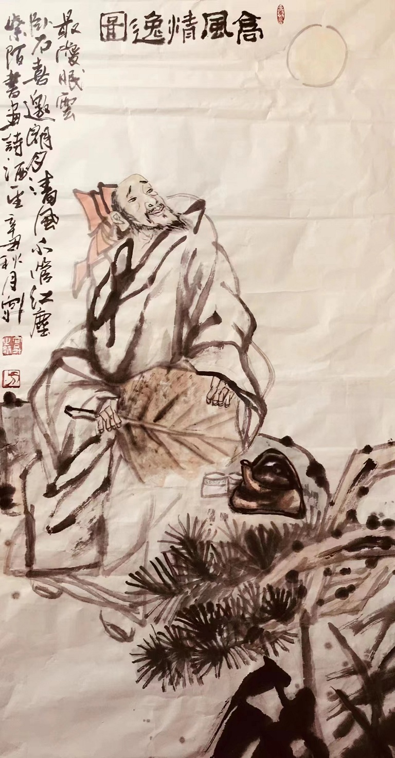 在写意人物画方面上,方向升先生是极其注重人物的传神感,而要想达到这一点,则就必须是要具备于相当深厚的笔墨功夫,是谓取象不惑也!画中人物题材,多是选用古代文人雅士的经典形象,并通过水墨的相互交融来实现其形质。特别是一些具有标志性意义的历史人物,他更能深刻洞察不同人物的神采特性,从而巧妙地描绘出生动有趣的画面,使每一幅人物画作都能洋溢着极其生动的意态感!笔墨写意一气呵成,文人风采陶写性情,自于浓墨处见神完,更于淡墨处见意足,此诚如古人所言诗画论,即丹青入巧思,万物无循形也!