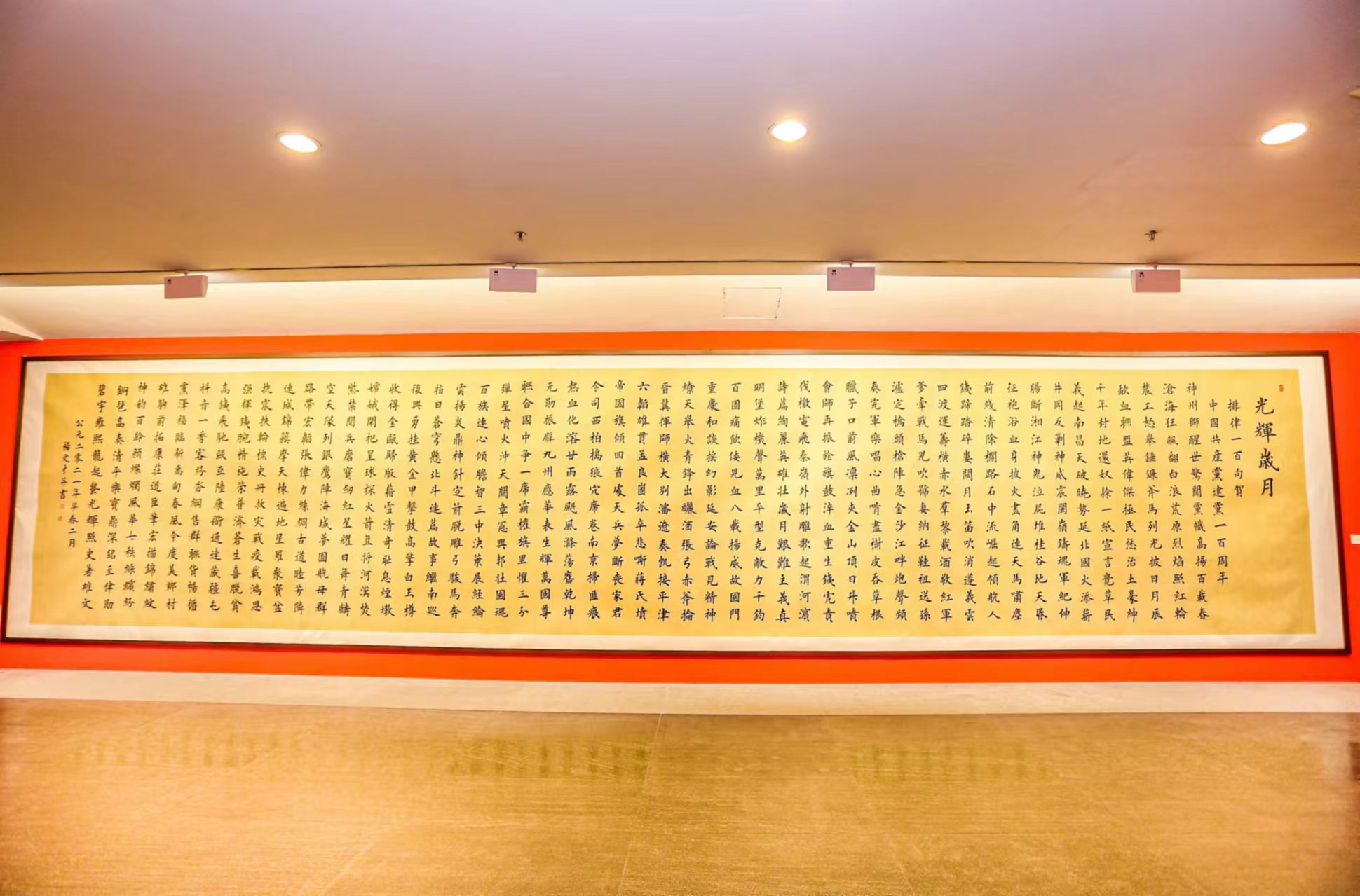 常言道,学书须先楷法,作字必先大字,楷书既成,乃纵为行书。而今杨文才先生提笔挥毫也正是有从楷正入手,一幅《光辉岁月》楷书作品,采用大幅制作,书中楷体取颜鲁公之雄健、又有欧、柳楷法的余韵参融,是谓师其正大而不遗余力也!字字楷法,是一点一画皆自始守正,即一点成一字之规,一字又为终篇之准也,其次布置,亦是不慢不越,清刚雅正,独具巧使之合宜,唐碑之骨气!由此书中楷法既有威仪神采,也见庙堂气概,既能题写红色精神,更能彰显大国格局,宏观之余,无不使人心神撼动!庄严高穆,无出其右!