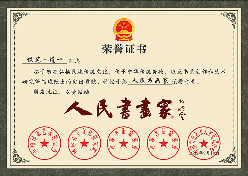 铁笔·道一,号:静香居士,出生于北京,现居江苏徐州。幼年拜师于中国”末代翰林”之一的钱崇威。1953年毕业于中央美术学院国画系。从师李可染、李苦禅、潘天寿、何海霞等诸位大师。家中藏书藏画颇丰。早年在陕西省国画院、中央美术学院从事美术理论与美术创作教学工作。现为:文玩古董鉴别师,荣宝斋特邀书画家,华山派三十三代玄裔,中国非物质文化遗产传承人,“中国百杰艺术家”,“世纪功勋艺术家”。