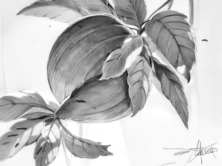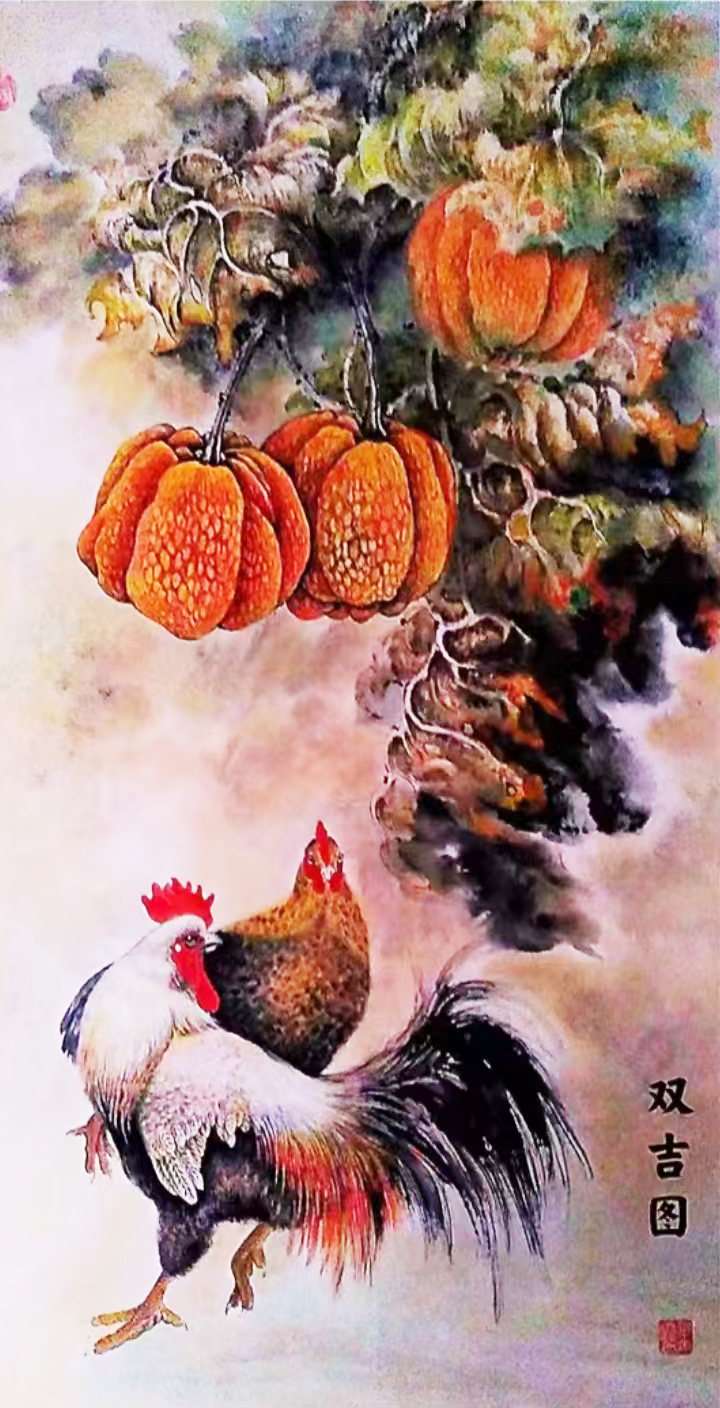 就比如说她的一幅《双吉图》作品,画中既以工笔取其神韵,又能以写意的渲染手法营造空间背景,尤其是后方的南瓜藤蔓,近处南瓜生得饱满沉重,似有摇坠之感,而稍远出的藤叶却并未过分描绘,转而则是以一种涨满晕染的写意氛围示人,由此所形成的前后关系,无论是色彩的运用效果,还是光影的明暗对比,在这幅画中都是有呈现出了相当丰富的层次性和意境性,再加上一对暗含画名的雌雄鸡禽,整幅画面便就更是增添了一股浓郁的乡野韵味,双鸡即为双吉也,情景和谐,寓意美好,如此佳作,自当令人雅俗共赏!