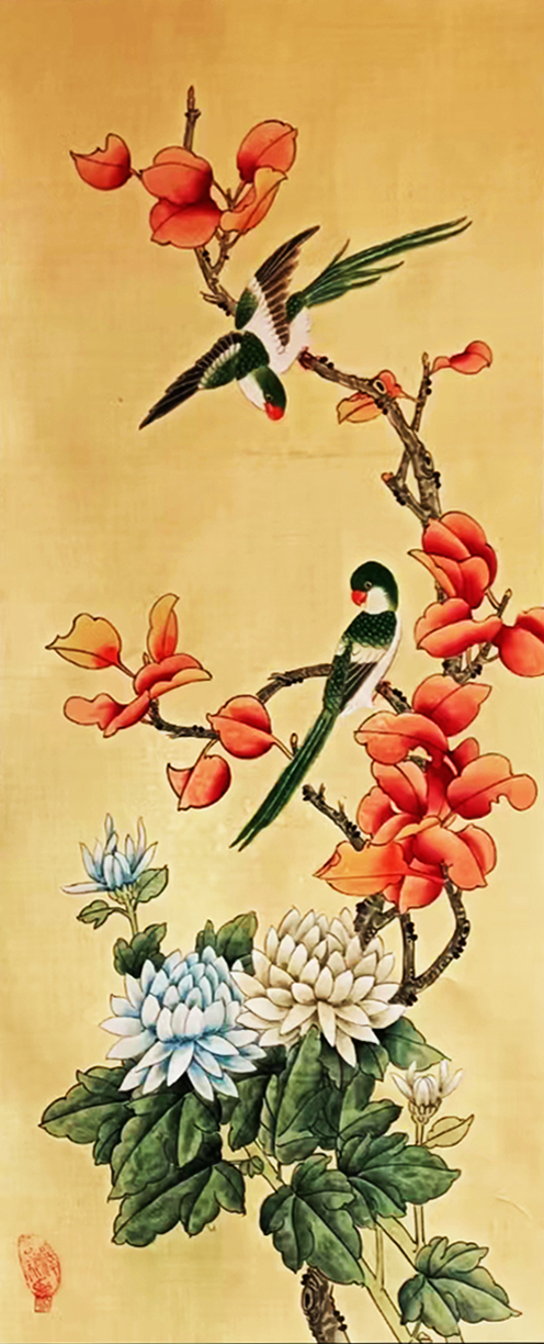 在技法上,毕玉霜女士走的正是一条工写兼备的创作道路,尤其是在用色方面上,她本人更是极其注重于墨色之间的对比效果和鲜明性,是谓随类赋彩不显丝毫之夸张。着色象其形采,渲染得其神气,由此凡画花鸟,可谓尽是取象洗练,生机盎然!更值得称赞的是,在一些花鸟作品中,毕玉霜女士甚至是大胆借鉴了一些类似于西方油画的用色技巧,即巧妙地运用色彩之间的复合关系,来赋予画作一种十分醇厚的写实质感。这一点,在她的大尺幅作品中最为显著。