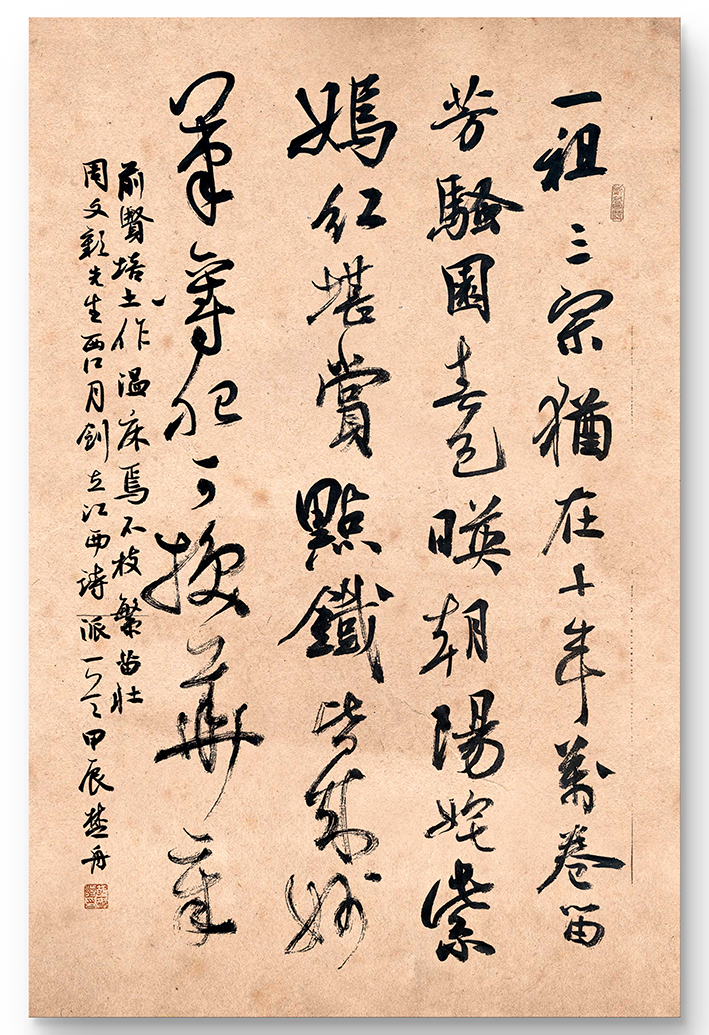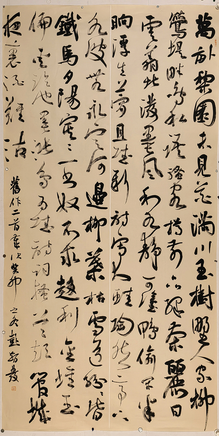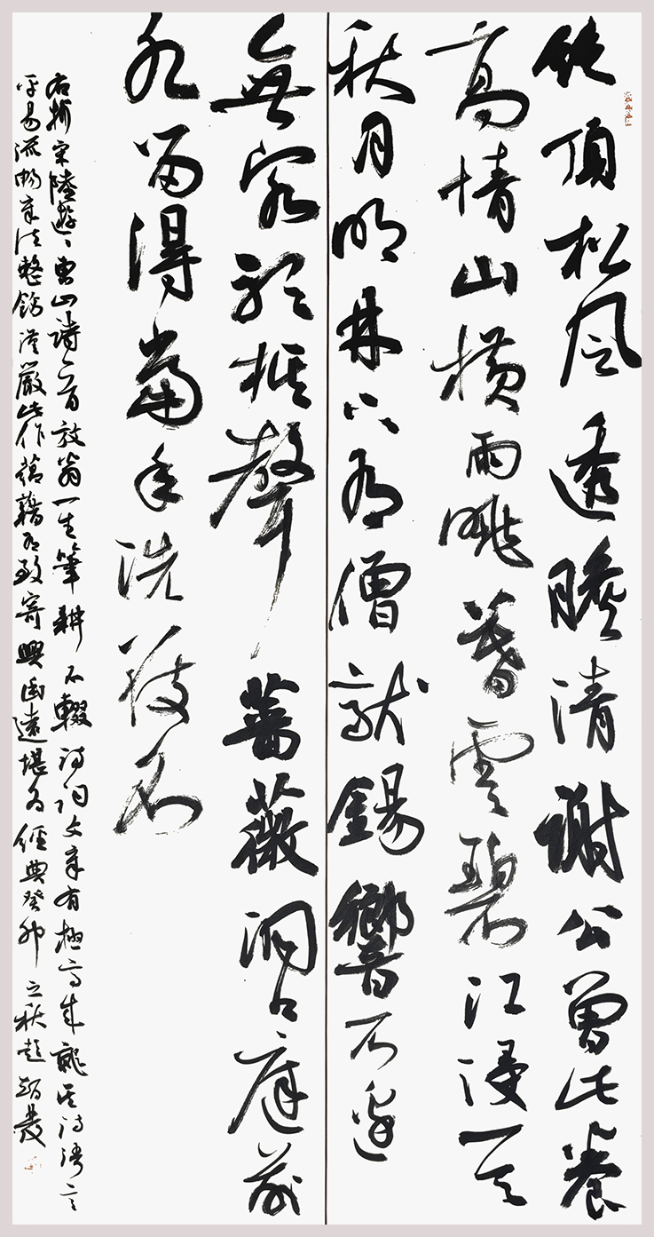 较于篆书和隶书,智发兄的行书作品则是更显威仪神采之美。其行书取法二王,又能兼顾于米芾、张旭之意,是谓纵意挥毫而不逾矩,使转自如游刃有余。一幅之中,浓墨蘸笔,书写纵横捭阖,中途从不停笔、亦不蘸墨,直至墨迹渐淡书写于飞白!点画如龙蛇奔走,撇捺似崩浪雷奔,时时更觉笔尽而意未尽,故全幅观之,实有魏晋文人之风骨!再加上题写内容的诗词篇章,整幅书法作品便就更是极具于书卷气概,耀质含章,文质相符,笔随心胸而挥毫,墨随情感而涌动,或寄以骋纵横之志,或托以散郁结之怀,笔性墨情,心手相应,所谓品高,正当如是!
