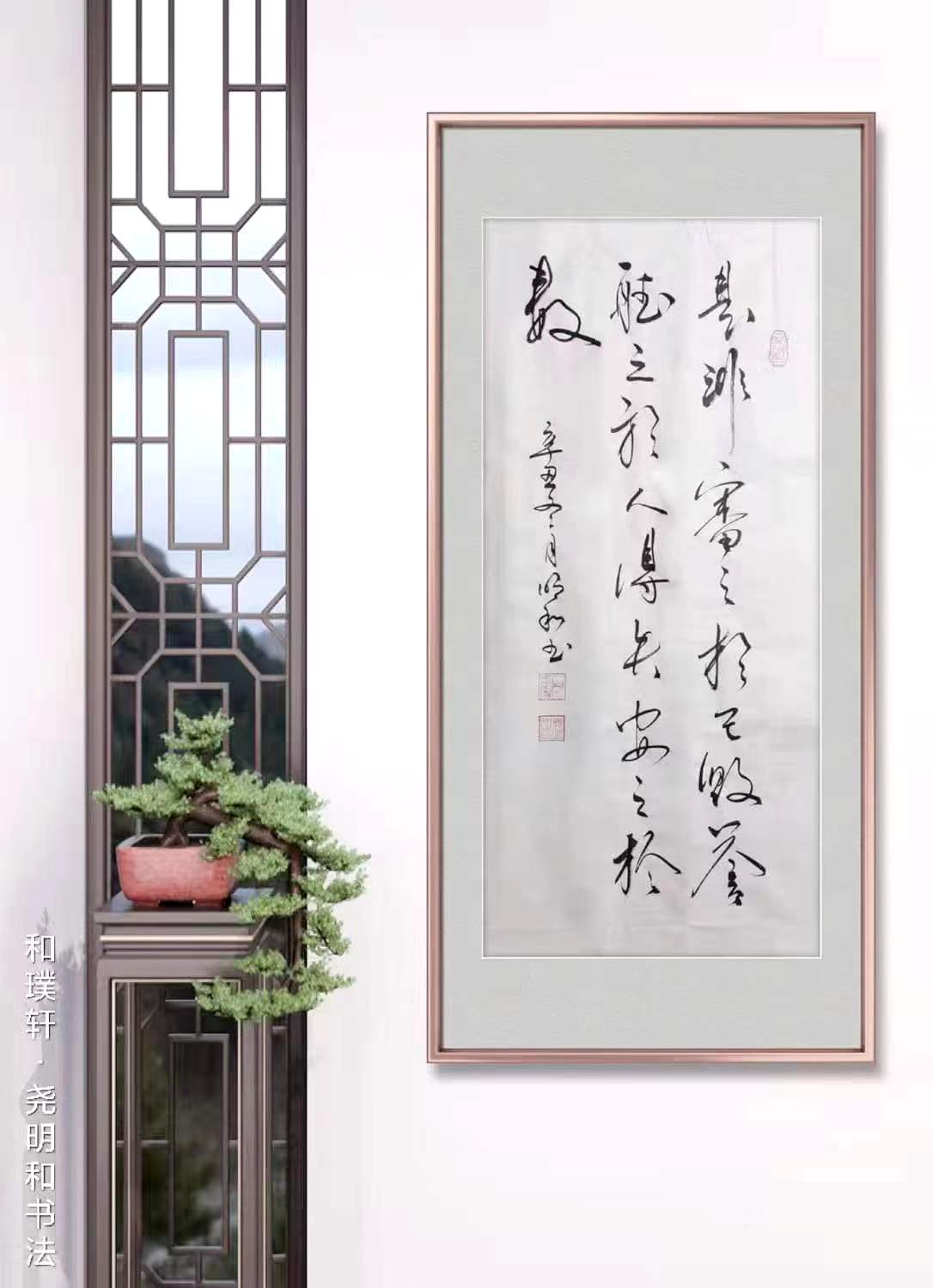 早在世纪初,尧明和曾携书法作品登门拜见启老先生,老先生将放大镜拿在手中端详,细观之后惊诧于色,良久方才说道:此书集百家所长而不着痕迹,非常年深耕而不可得之。结体自然,工整活沷,庄雅飘逸,灵气盎然,有绝尘世外之姿。用墨浓淡适度,清新自然,疏密有致,其密处如玉镯随放,其疏处如孤梅傲雪,放笔处如芝兰横生,垂带处如柳丝悬江。