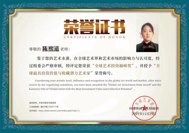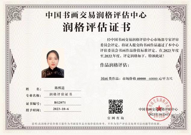 陈熙道被评为最具投资价值和收藏潜力艺术家(2021-2023年成交价均为15万每平尺)