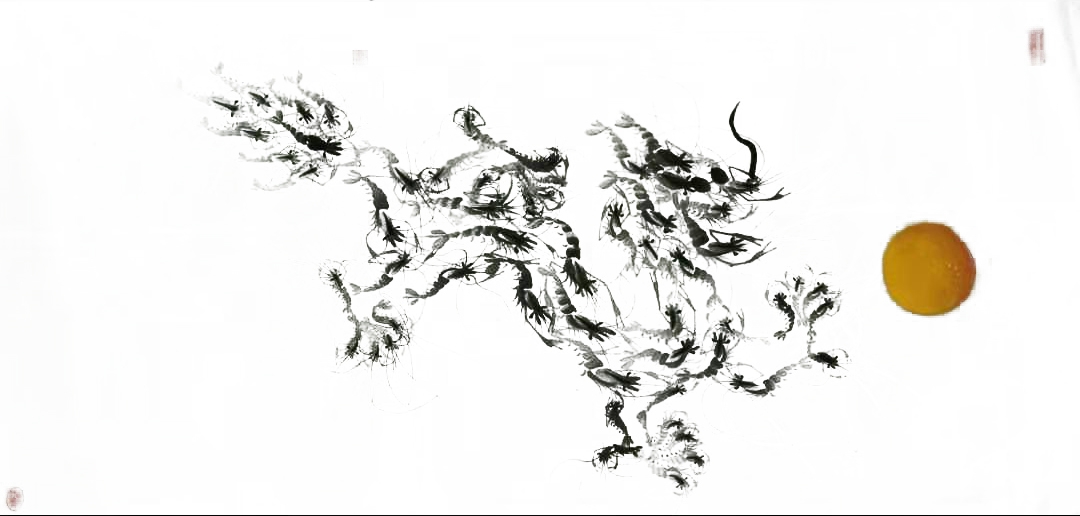 56条虾组成了一条巨龍,(在这里虾代表龍)在世界的东方有56个民族生活在中国大地上,中国人是龍的传人,中国有56个民族的人民英雄,历年来,逢年过节中国人都以龍的形式来宣传赞扬英雄,为中国英雄歌功颂德!白石再传弟子李秀云经过多次反复研究,创作出了这幅中国巨龍。
