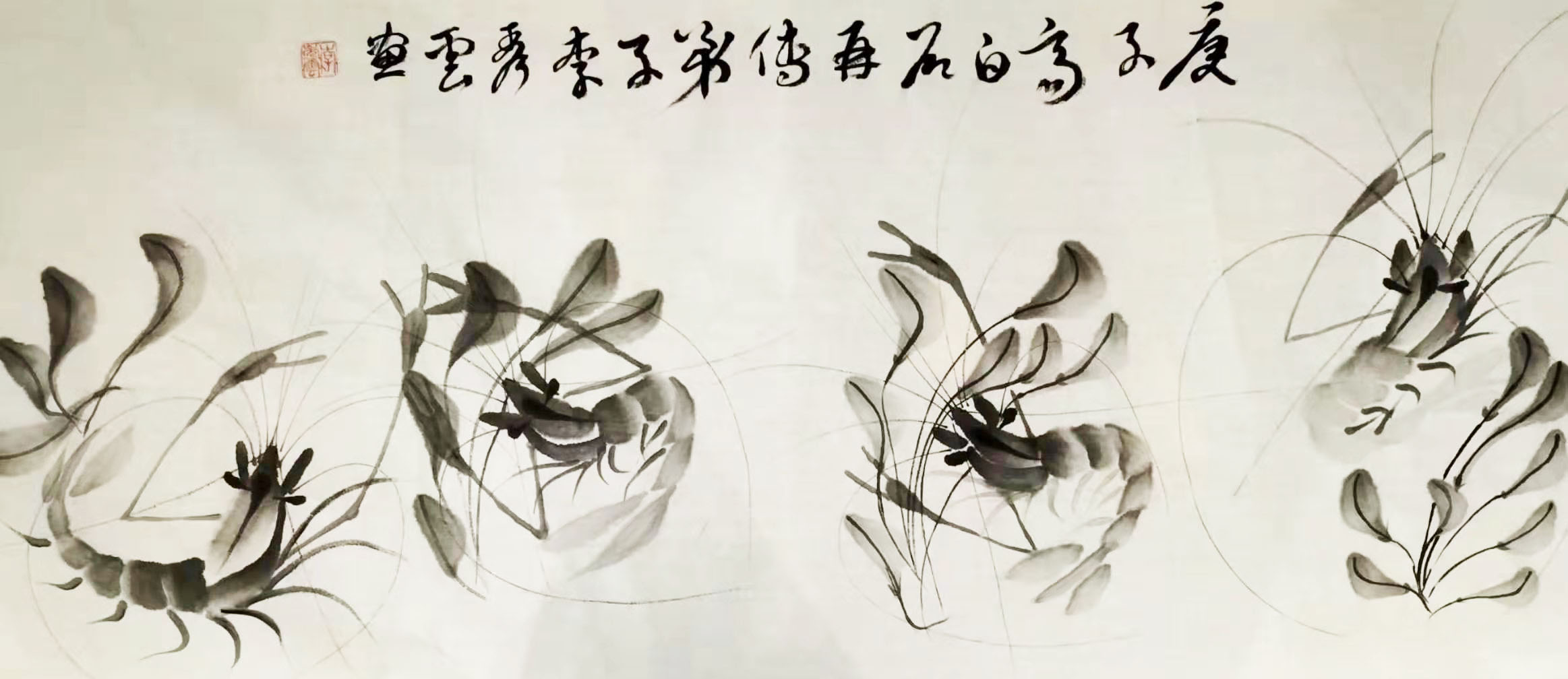 李秀云老师为迎接十九大召开特创百米长卷《神龙见首不见尾》,十条巨龙每条以九十九只虾组成。(虾代表龍)