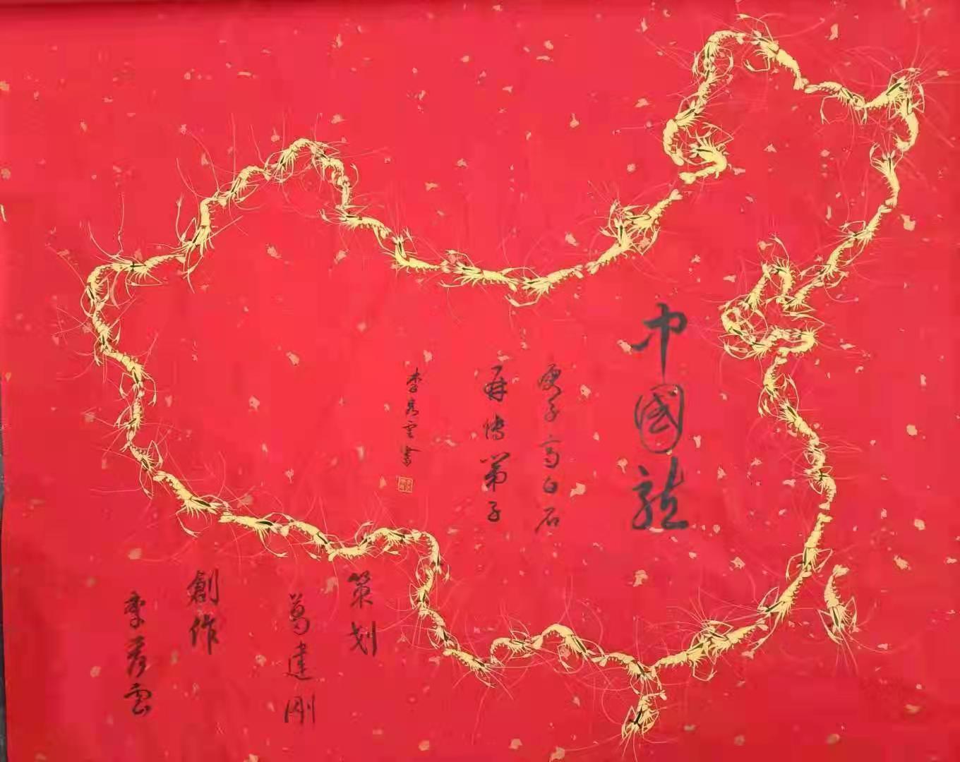 近年来我在传承白石大师墨虾的基础上坏断的创新,该作品以虾作龍来表现中国大地上生活着56个民族,我们又是龍的传人。通过反复不懈的努力,于2021年1月初终于如愿以偿,56条金龍展现在了中国的图型上,红底映衬金龍显现吉祥,象征着全国山河一片红,金龍跃然腾飞! 56条金龍代表56个民族,团结友爱为实现梦想,共筑人类命运共同体而努力!形成了凝聚的力量!这幅作品在世界的东方巍然屹立,展示中华民族的伟大形象和崛起!