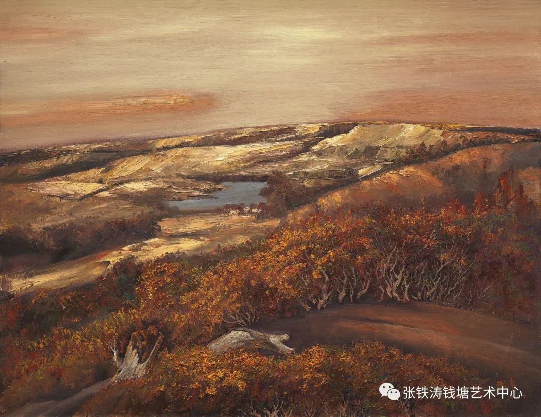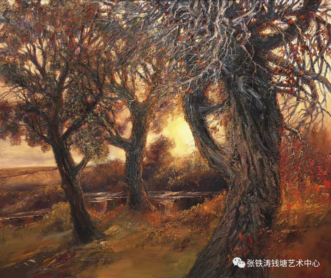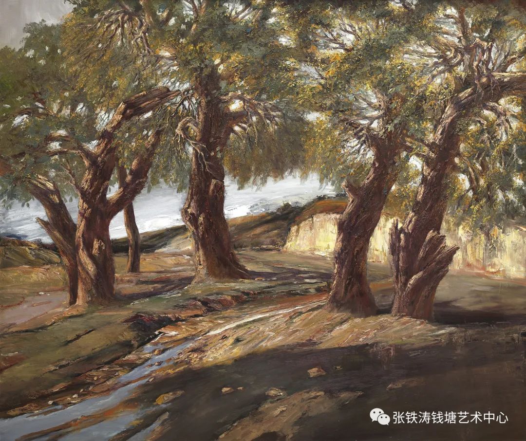 “胡杨的力量感一直是画家创作敏感之所在这种原生力来自胡杨本身 是自然的造化正是感受到了胡杨这份原生力才创作出胡杨拔地而起、不可一世的气势 ,正所谓观画观风貌赏画赏精神”