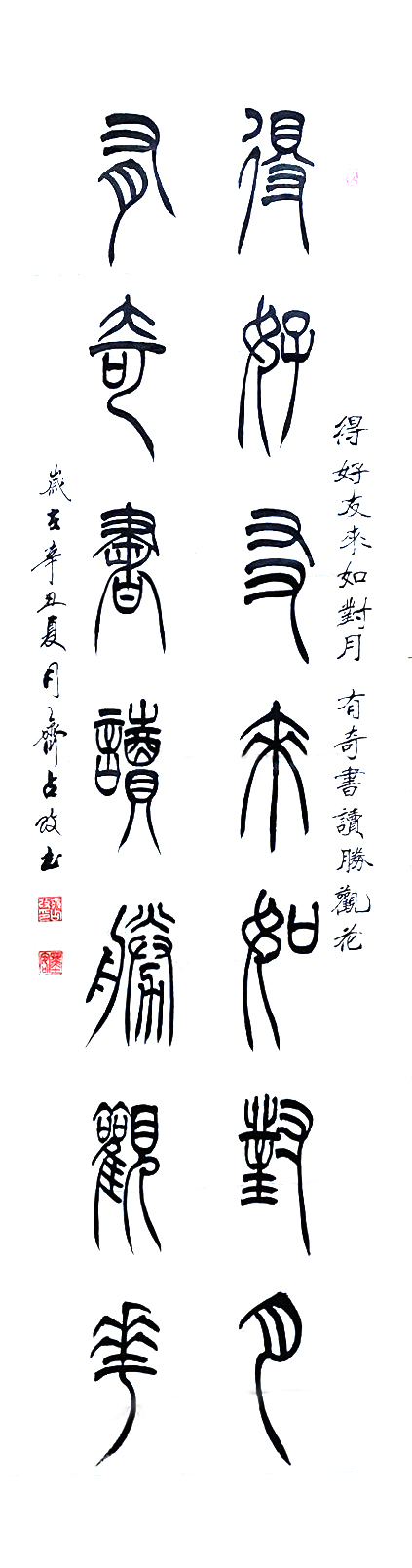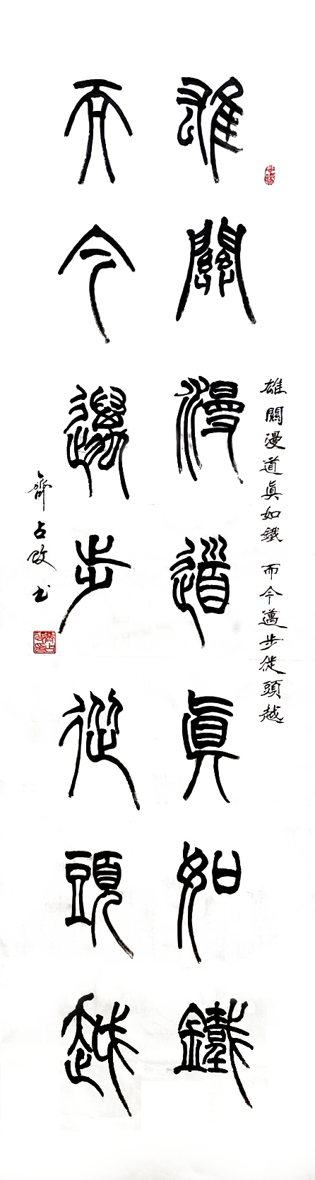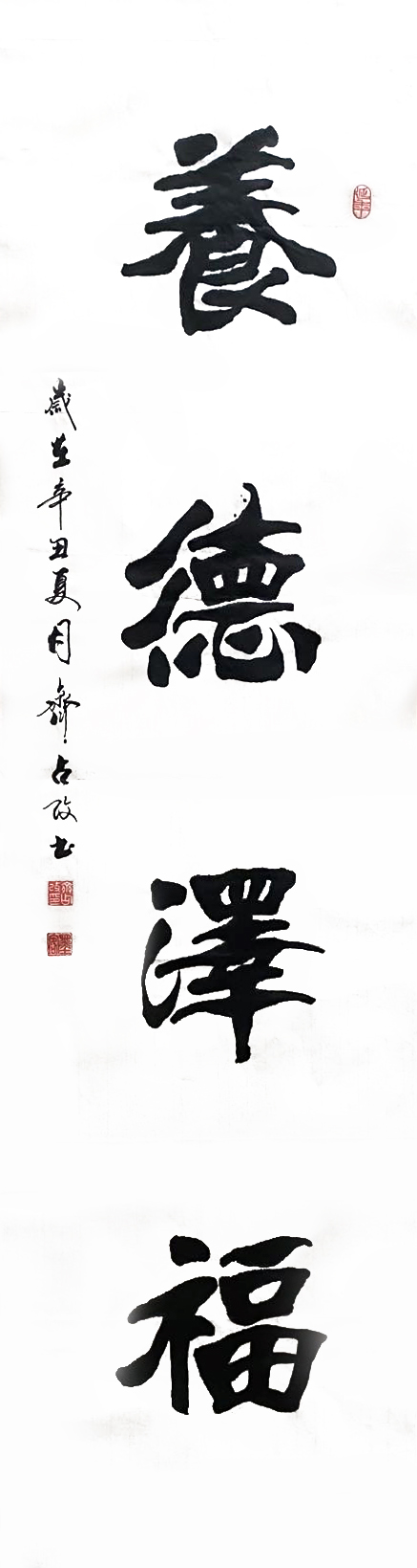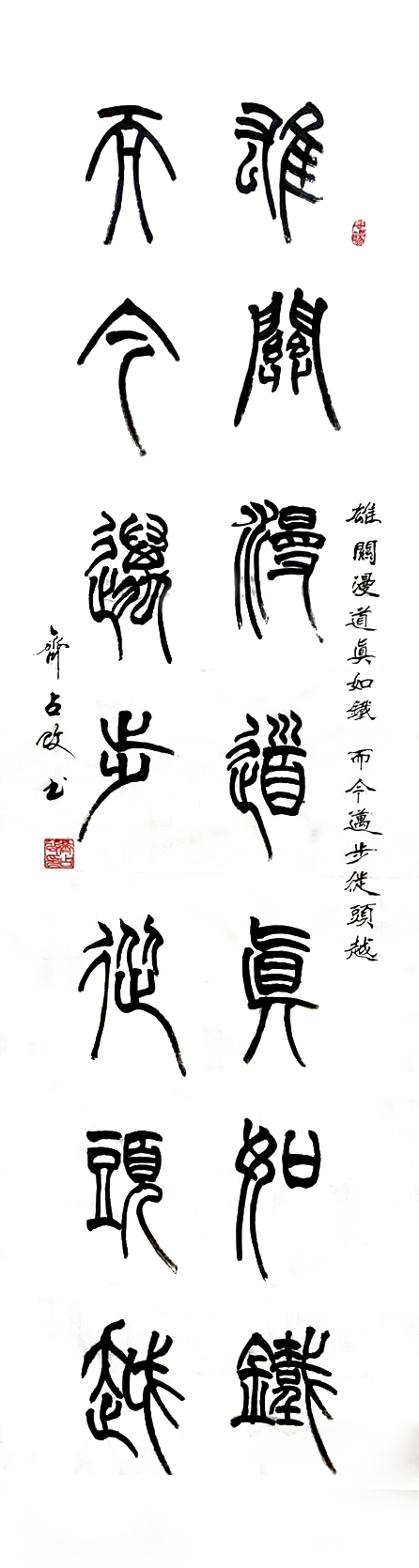 本人自幼喜爱书法,学生时期从师学书,曾临习柳颜欧赵楷书多年,后研习篆书、汉隶、魏碑体等。数十年持之如一,逐步形成个人风格。任教期间曾兼任初、高中学生硬、软笔书法课多年,并稍有成绩。