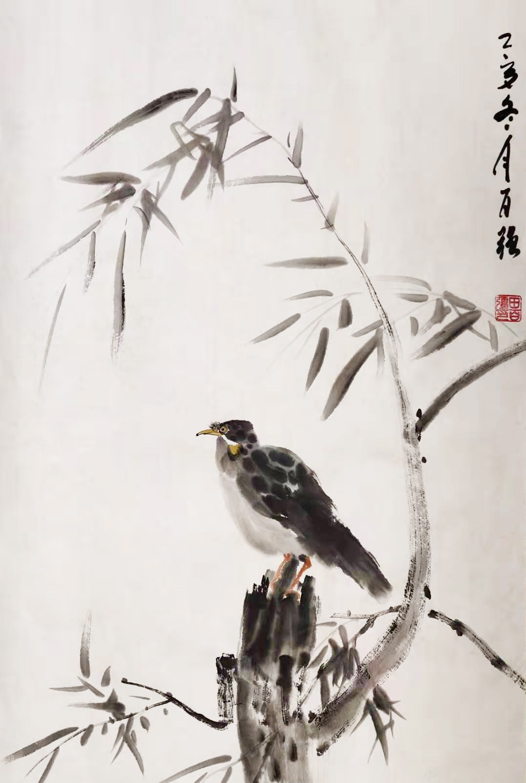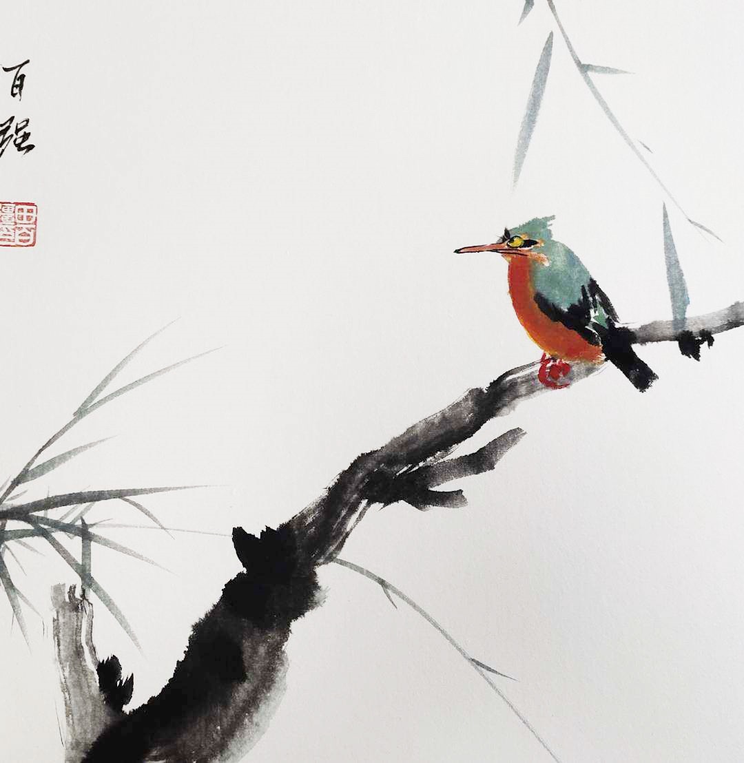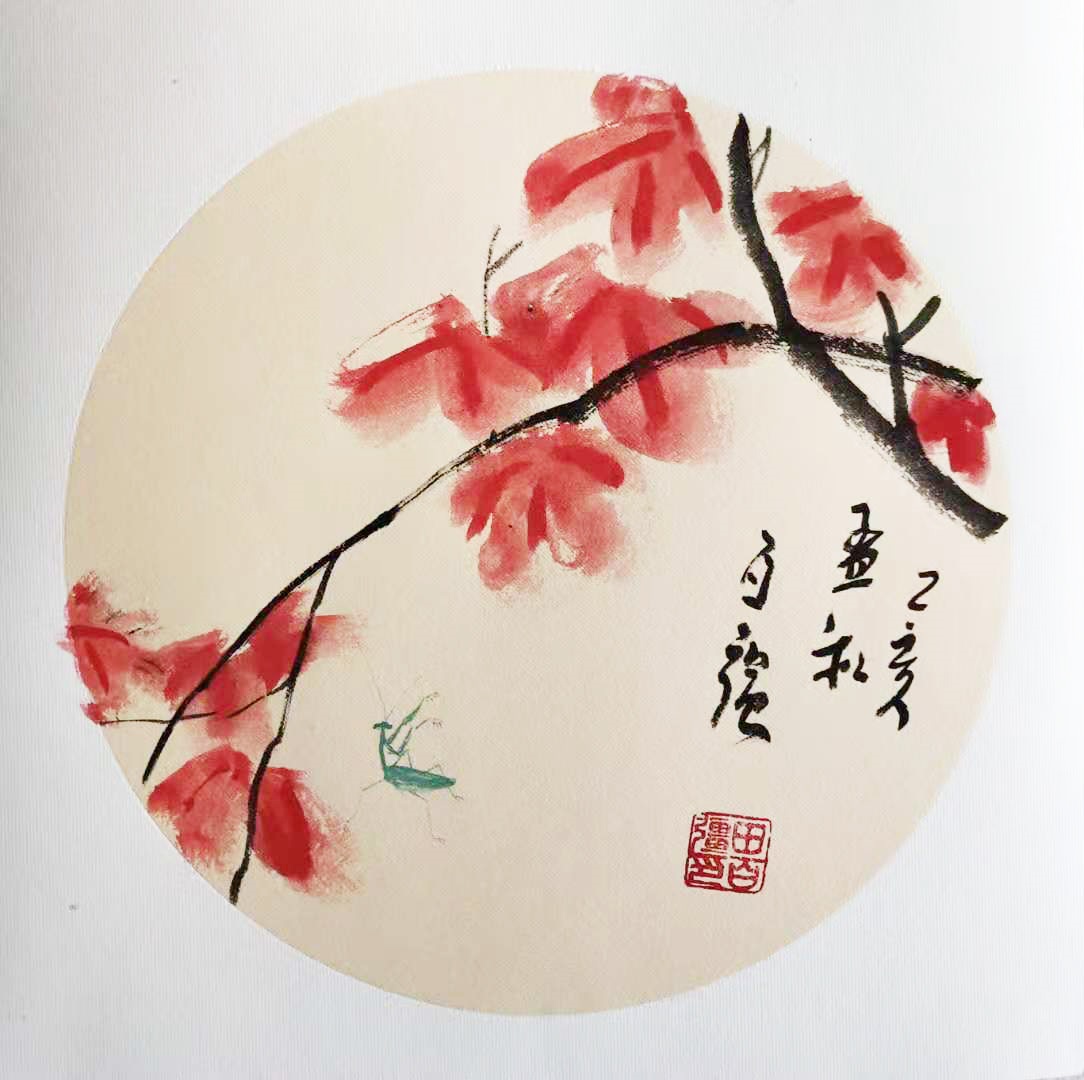百强选学的是写意花鸟画。齐白石老人对中国写意花鸟画的造型要求是在“似与不似之间”,要求既不“媚俗”,又不“欺世”。百强在其画中就充分体现了这点。他的画既有黑与红、赭与青的色彩强烈对比,又有工与写、巧与拙的技法展现。在他画的草虫类花鸟画中,利用赭石画稻谷,用墨画螃蟹,用花青草绿画草虫等等,均能体现传统花鸟画的笔墨特色。尤其是他画的《红枫螳螂》中,利用曙红的浓淡鲜活、透亮画出枫叶,浓墨干笔画出枫树枝干,使画面产生强烈的对比;而且在左下方的画眼处工写出一只干笔淡墨浅赭色的螳螂,显得笔墨精妙,生机盎然。落款与用印亦恰到好处的起到了打破枝干两端的均衡,有稳定画面重心之妙用。
