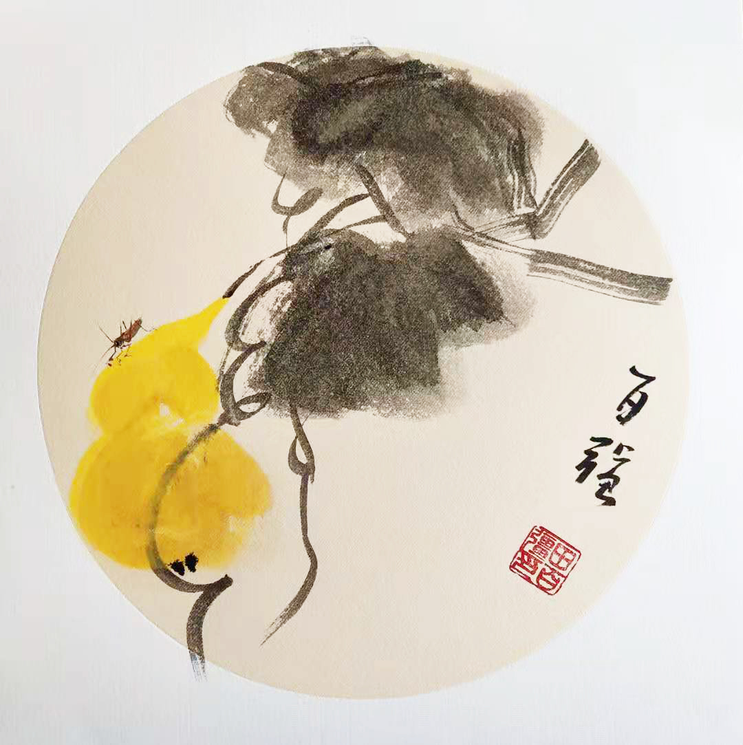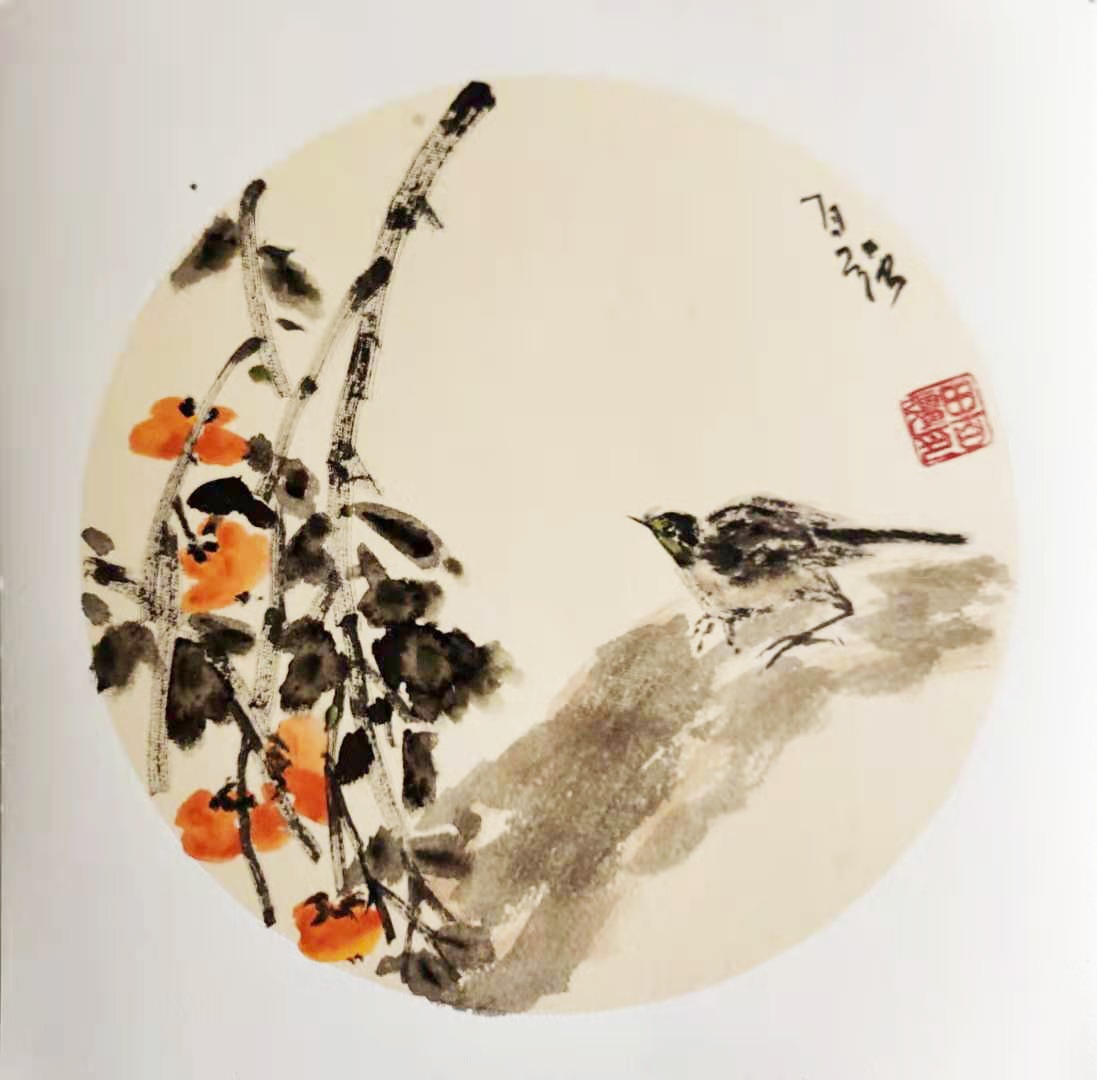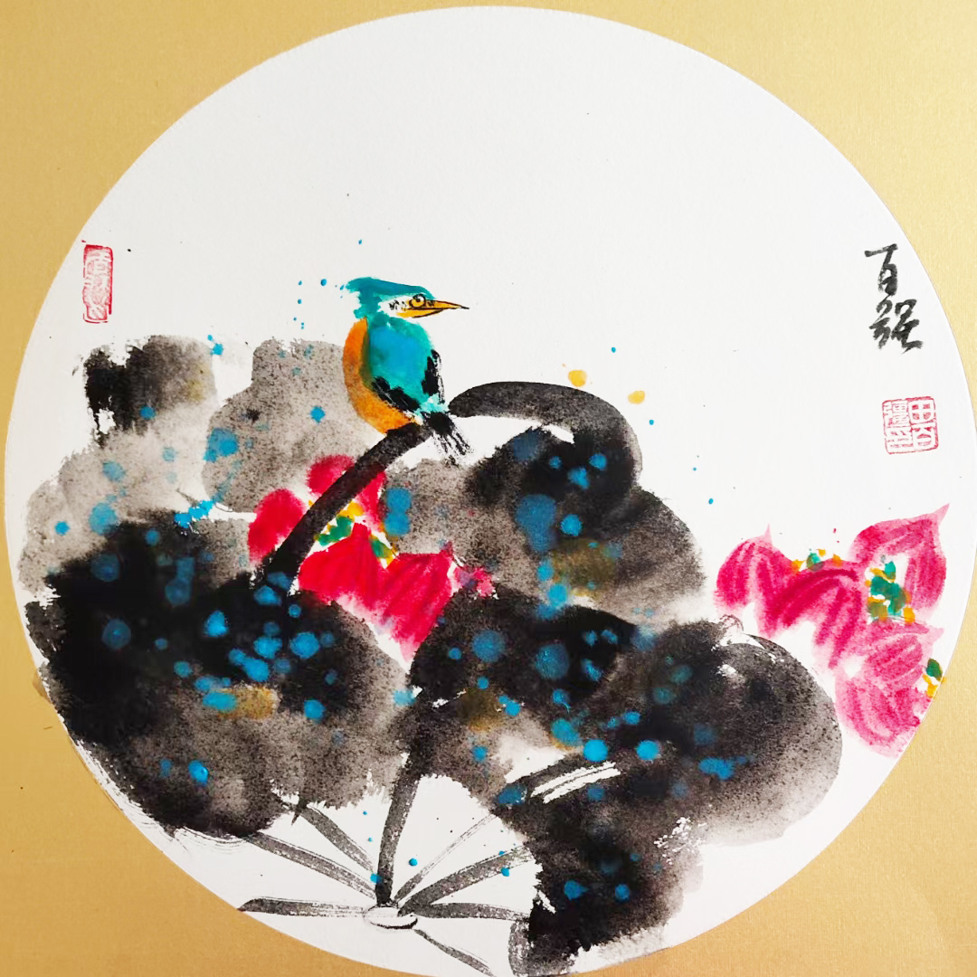 百强选学的是写意花鸟画。齐白石老人对中国写意花鸟画的造型要求是在“似与不似之间”,要求既不“媚俗”,又不“欺世”。百强在其画中就充分体现了这点。他的画既有黑与红、赭与青的色彩强烈对比,又有工与写、巧与拙的技法展现。在他画的草虫类花鸟画中,利用赭石画稻谷,用墨画螃蟹,用花青草绿画草虫等等,均能体现传统花鸟画的笔墨特色。尤其是他画的《红枫螳螂》中,利用曙红的浓淡鲜活、透亮画出枫叶,浓墨干笔画出枫树枝干,使画面产生强烈的对比;而且在左下方的画眼处工写出一只干笔淡墨浅赭色的螳螂,显得笔墨精妙,生机盎然。落款与用印亦恰到好处的起到了打破枝干两端的均衡,有稳定画面重心之妙用。