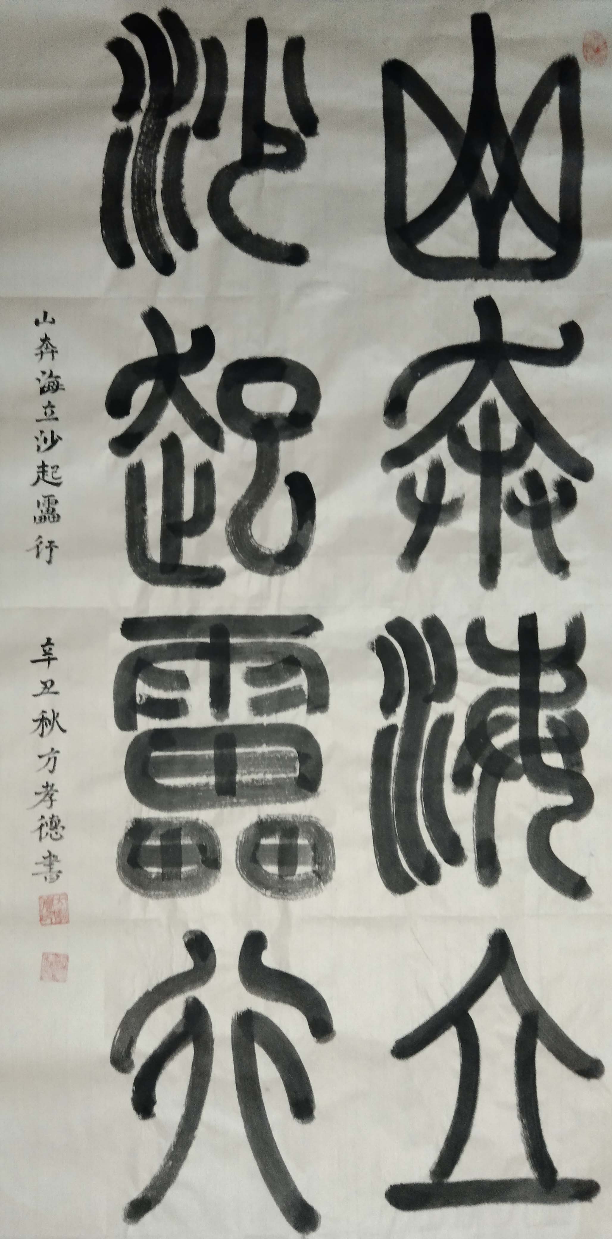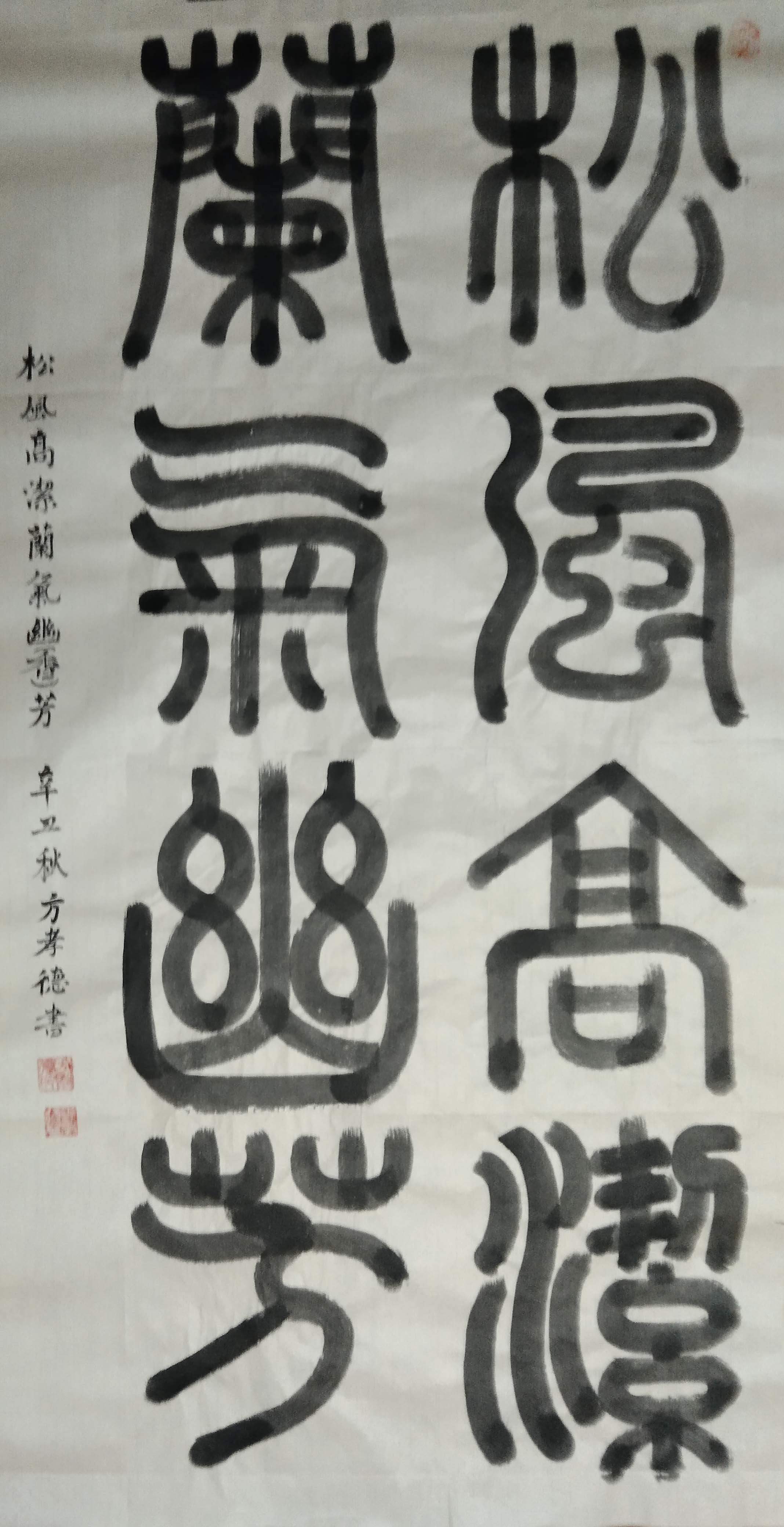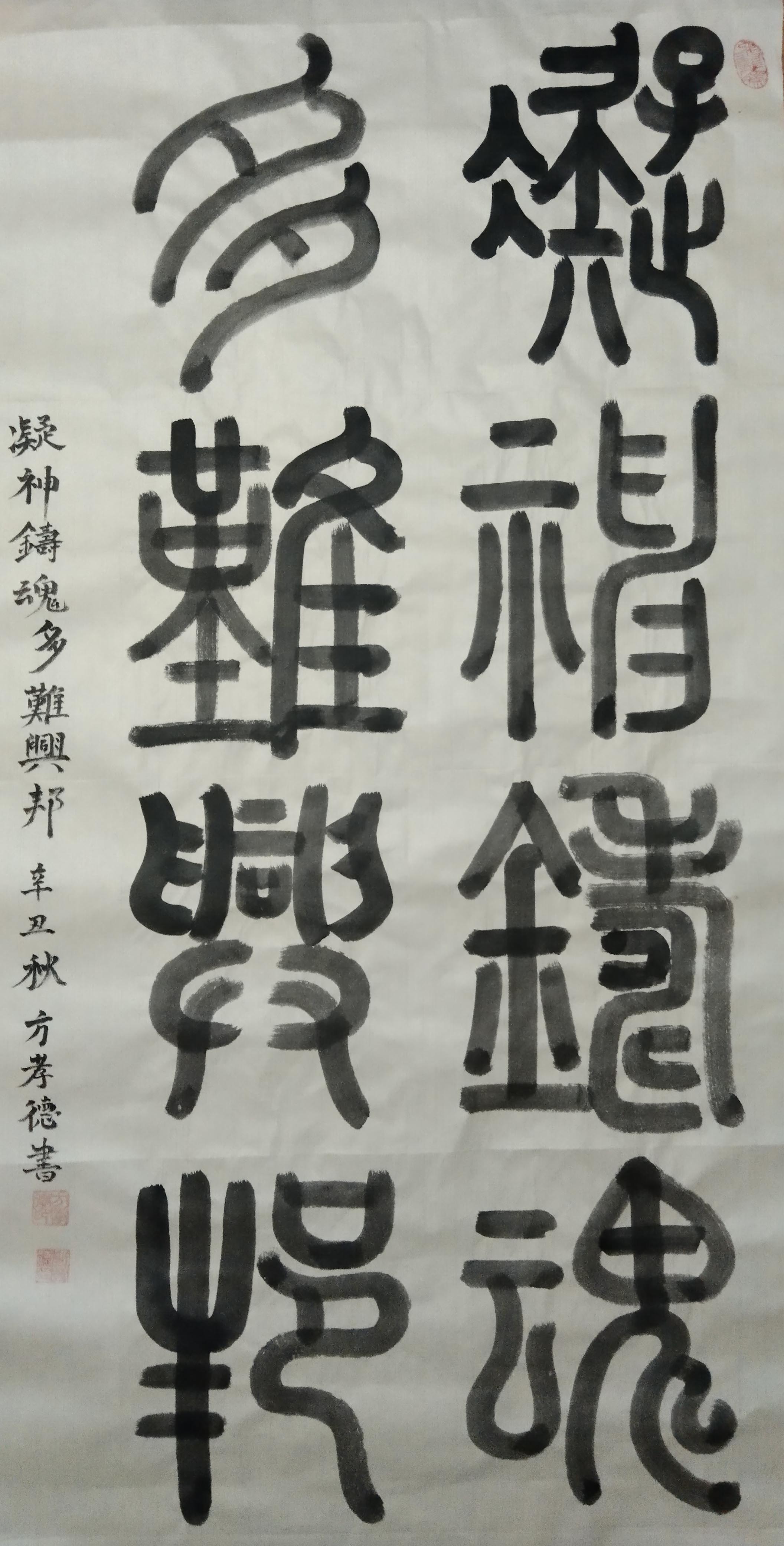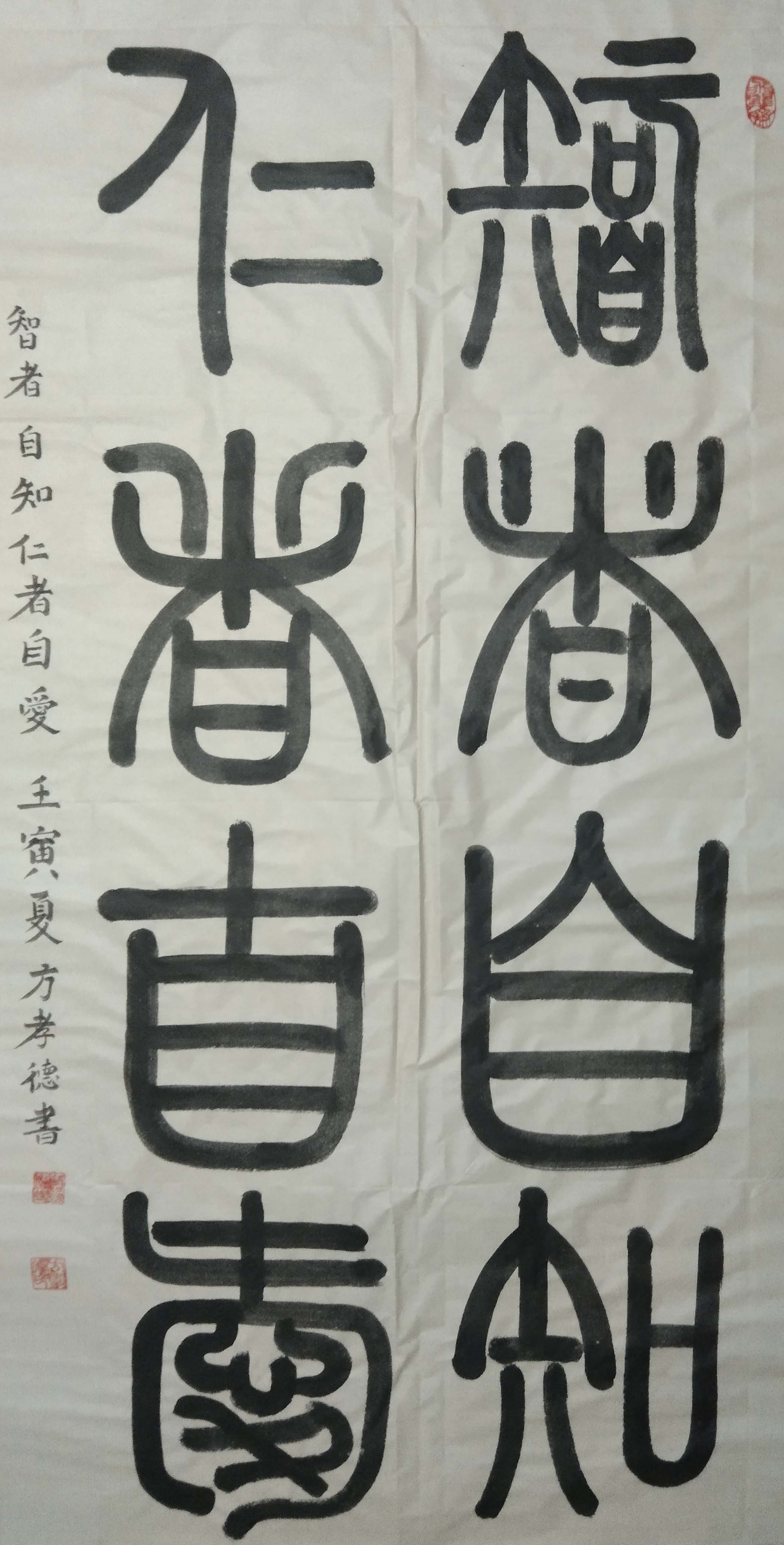方孝德 字飞龙,男,一九六零年生,内蒙古鄂尔多斯伊金霍洛旗人,现住内蒙古包头市青山区,自幼受父亲熏陶,热爱中国传统文化熟读四书五经,师承中国古象形文字第一人刘泮书先生研习古文字并且在古文字(饕餮文)魏国的雀书的研究上有所突破取得了很大成就,添补了这一研究领域的国内空白;主要研习篆字并且得到罗美富、王胜利等多名书法名家的长期指导。现为中国文化(非遗)传承人,中国国艺人民书画院副院长,中国书法家协会会员,中国硬笔书法协会会员,中国文化高级书法师,中国国家教育电视台水墨丹青书画院会员等,全国人大.全国政协十三届二次,十三届四次官方宣传活动重点推荐:人民艺术家:荣誉称号。近四十载春秋努力,从楷书欧、颜入手遍临吏书,主要写篆书,笔法流畅、中正厚重、古朴典雅、气韵生动,承继秦李斯唐李阳冰书写特点,颇具大家风范。