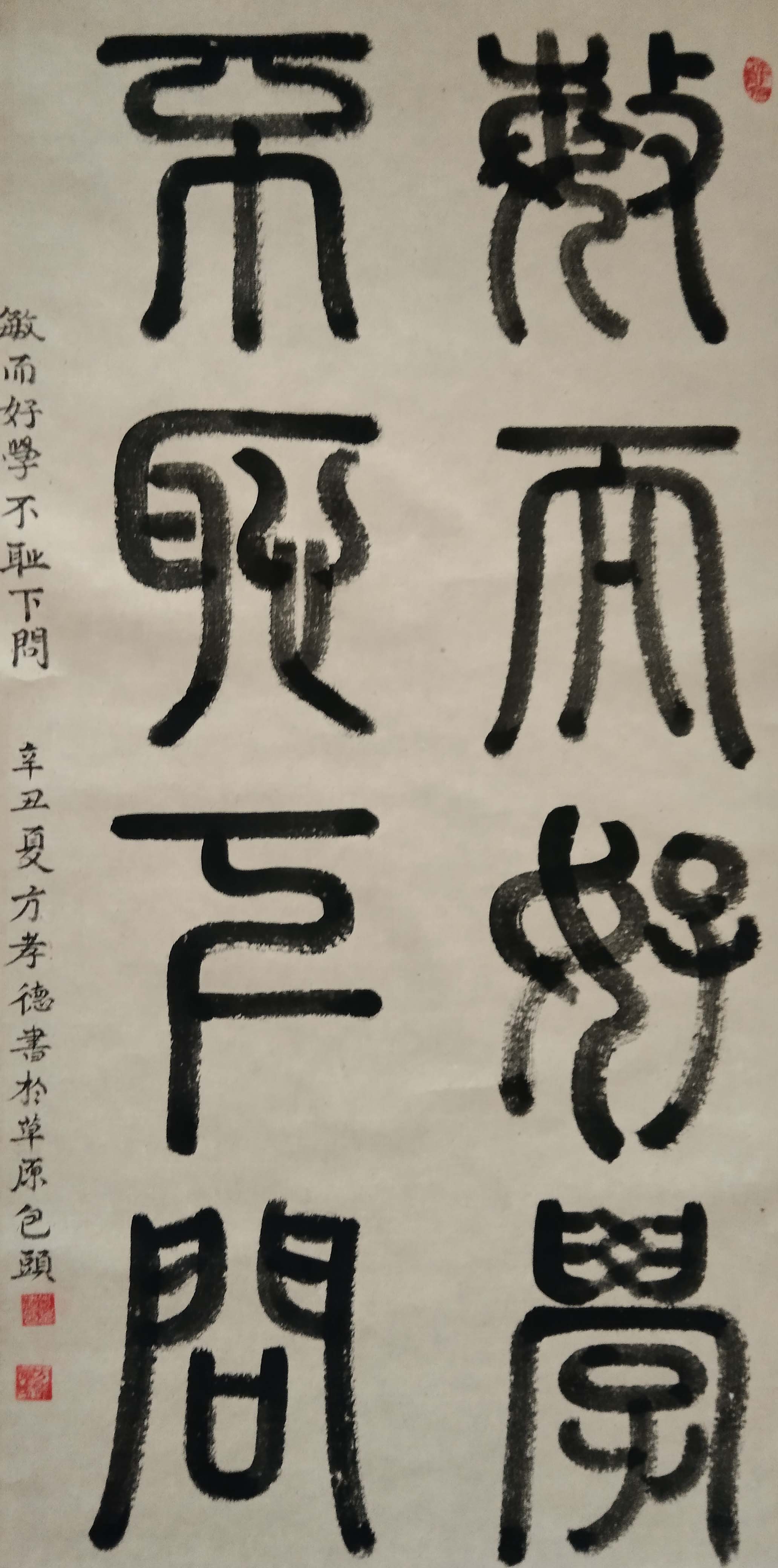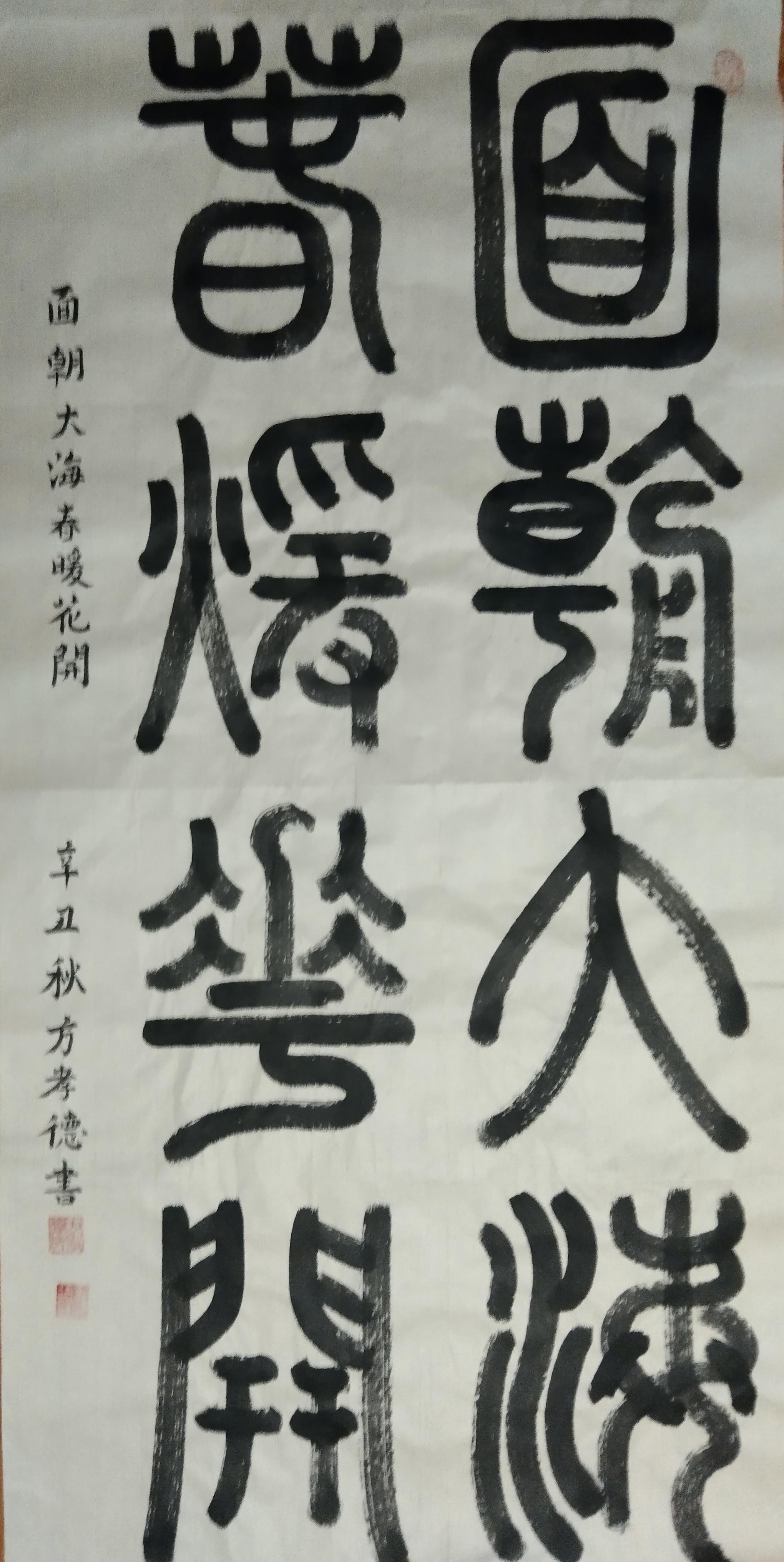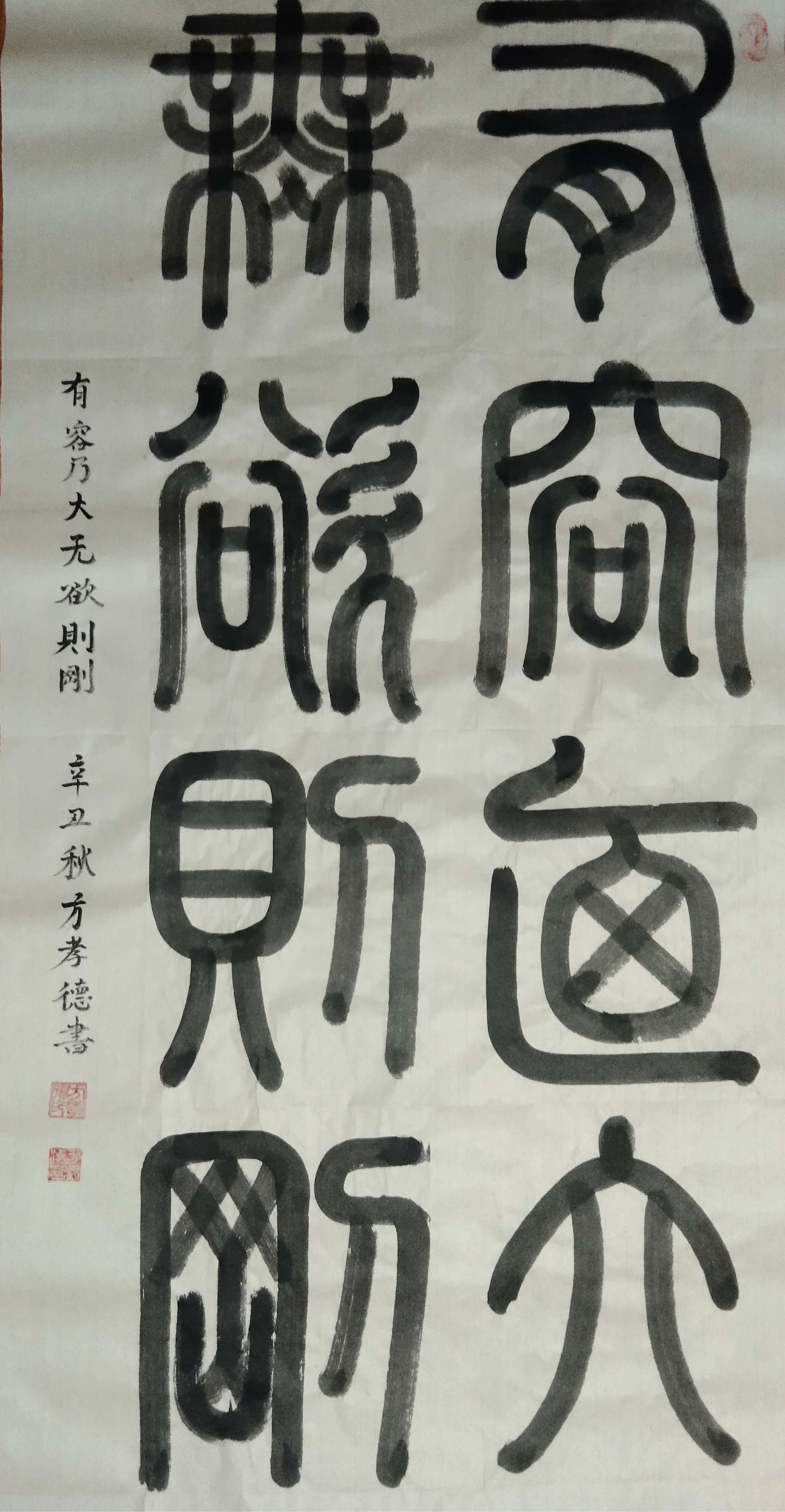 方孝德 字飞龙,男,一九六零年生,内蒙古鄂尔多斯伊金霍洛旗人,现住内蒙古包头市青山区,自幼受父亲熏陶,热爱中国传统文化熟读四书五经,师承中国古象形文字第一人刘泮书先生研习古文字并且在古文字(饕餮文)魏国的雀书的研究上有所突破取得了很大成就,添补了这一研究领域的国内空白;主要研习篆字并且得到罗美富、王胜利等多名书法名家的长期指导。现为中国文化(非遗)传承人,中国国艺人民书画院副院长,中国书法家协会会员,中国硬笔书法协会会员,中国文化高级书法师,中国国家教育电视台水墨丹青书画院会员等,全国人大.全国政协十三届二次,十三届四次官方宣传活动重点推荐:人民艺术家:荣誉称号。近四十载春秋努力,从楷书欧、颜入手遍临吏书,主要写篆书,笔法流畅、中正厚重、古朴典雅、气韵生动,承继秦李斯唐李阳冰书写特点,颇具大家风范。
