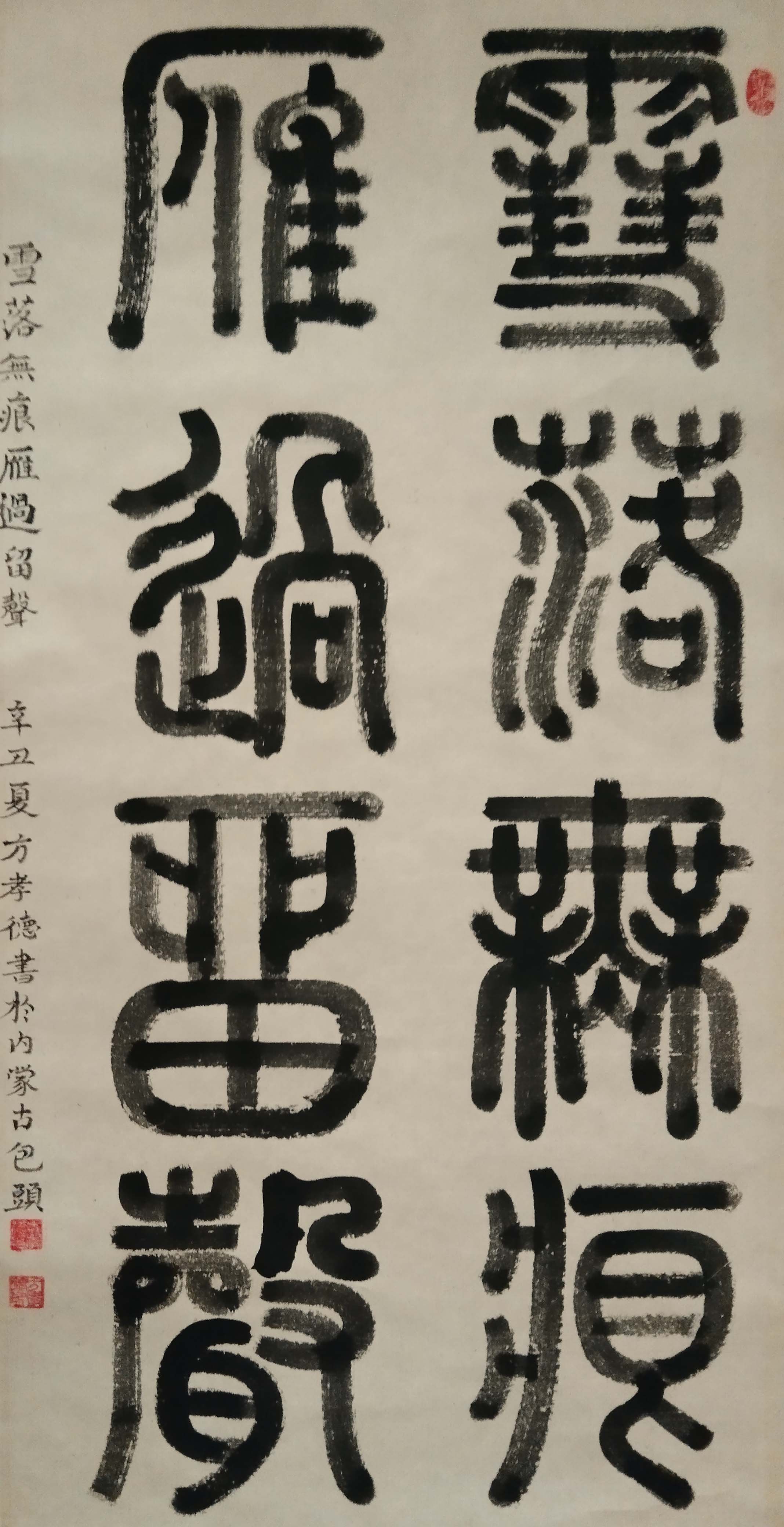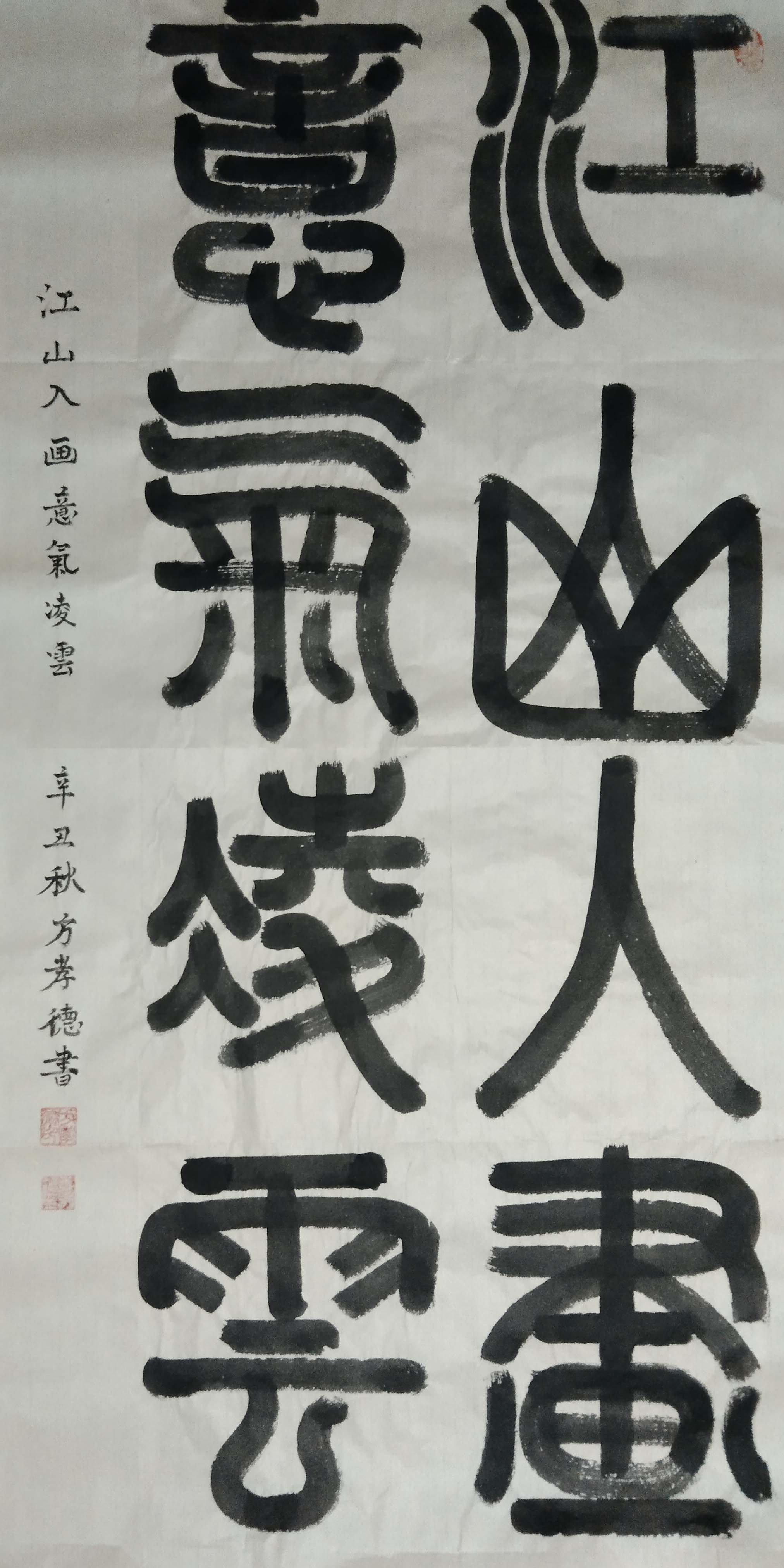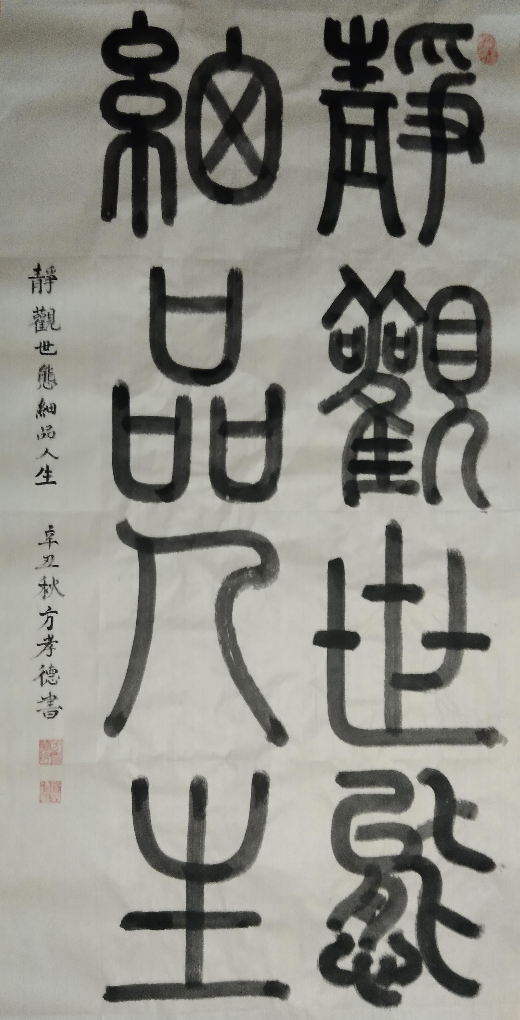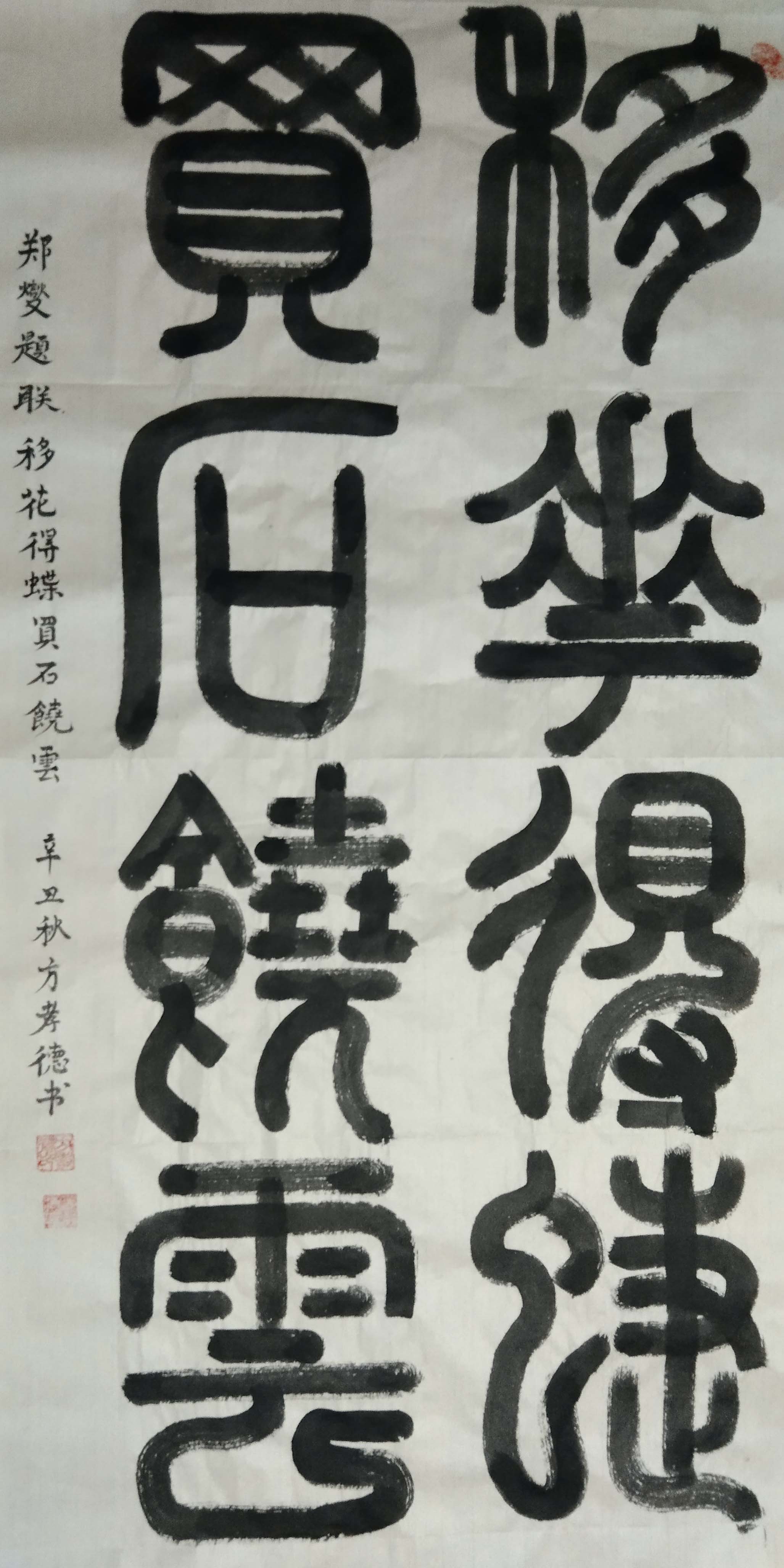 方孝德 字飞龙,男,一九六零年生,内蒙古鄂尔多斯伊金霍洛旗人,现住内蒙古包头市青山区,自幼受父亲熏陶,热爱中国传统文化熟读四书五经,师承中国古象形文字第一人刘泮书先生研习古文字并且在古文字(饕餮文)魏国的雀书的研究上有所突破取得了很大成就,添补了这一研究领域的国内空白;主要研习篆字并且得到罗美富、王胜利等多名书法名家的长期指导。现为中国文化(非遗)传承人,中国国艺人民书画院副院长,中国书法家协会会员,中国硬笔书法协会会员,中国文化高级书法师,中国国家教育电视台水墨丹青书画院会员等,全国人大.全国政协十三届二次,十三届四次官方宣传活动重点推荐:人民艺术家:荣誉称号。近四十载春秋努力,从楷书欧、颜入手遍临吏书,主要写篆书,笔法流畅、中正厚重、古朴典雅、气韵生动,承继秦李斯唐李阳冰书写特点,颇具大家风范。