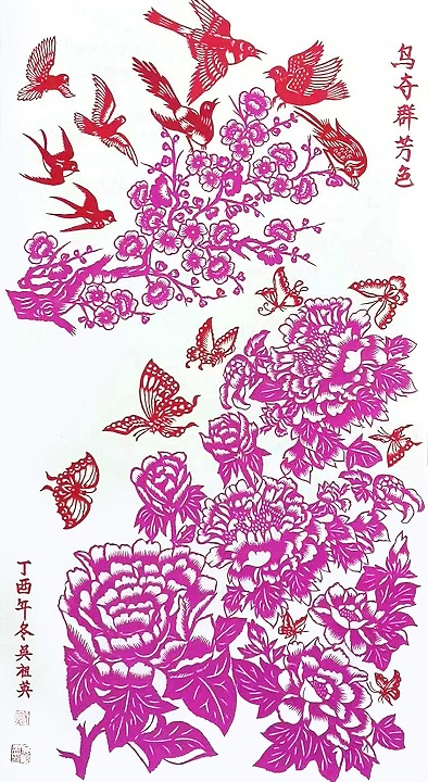 吴祖英老师自幼喜爱艺术,因长期从事某保密单位技术工作,无暇顾及个人爱好,退休后开始学习创作剪纸,创作中借鉴融合其它艺术门类精髓,为我所用,不断完善剪纸作品,作品参加过省、市、县、国家开发区等各级政府和企组织的书画剪纸艺术展,被各级政府收藏的剪纸作品有30余幅,捐增的剪纸作品有50余幅,2012年参加河北省十八大作品展并获奖,2015年8月北京红博馆、2019年11月三河市文联曾为吴祖英举办了《吴祖英剪纸艺术展》,整理出版了《我的剪纸艺术》《老年学剪纸教程》《趣味学剪纸.动物篇》,(由北京工艺美术出版社出版),《剪纸艺术作品集》(由中国国际出版社出版)。2022年参加二