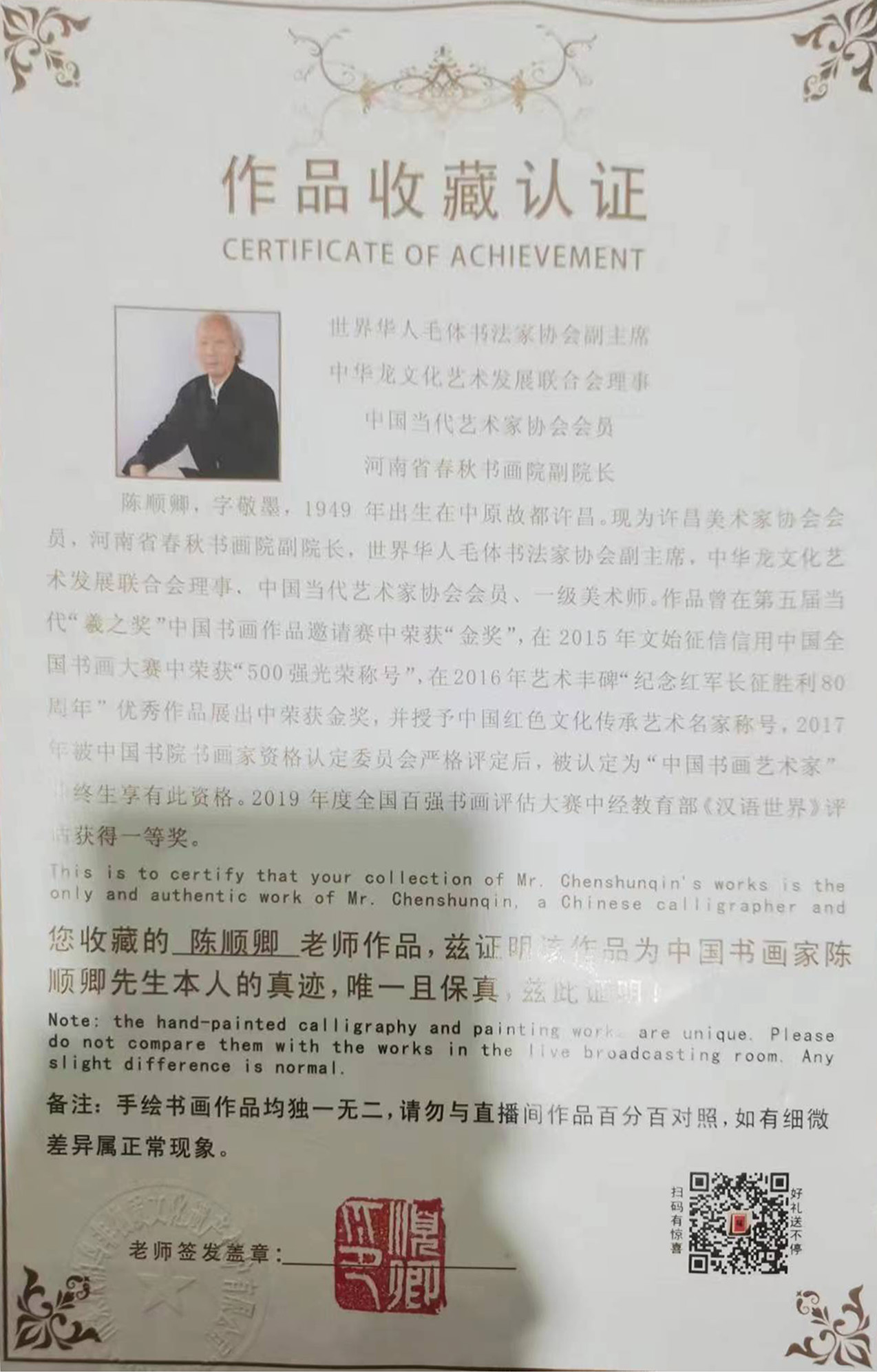 陈顺卿与齐白石,俞继高,潘天寿,并称中国花鸟四大家。1949年生于中原古都许昌,中国国际美术家协会理事,中国美协国家重大题材美术创作艺委会教授,文化部国家主题性创作项目专家指导委员会委员,中国画学会常务理事,中国国家画院研究员,中国艺术研究院中国画院研究员,中国美术家协会会员,中央文史馆书画院研究员、北京文史馆馆员、北京大学艺术学院、中国人民大学艺术学院教授中国国家画院高研班导师、国家一级美术师。中国当代著名书画家;中国书画百杰;中国功勋艺术家;中国当代杰出书画家;中国艺术劳动模范。