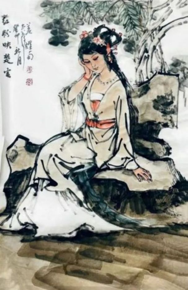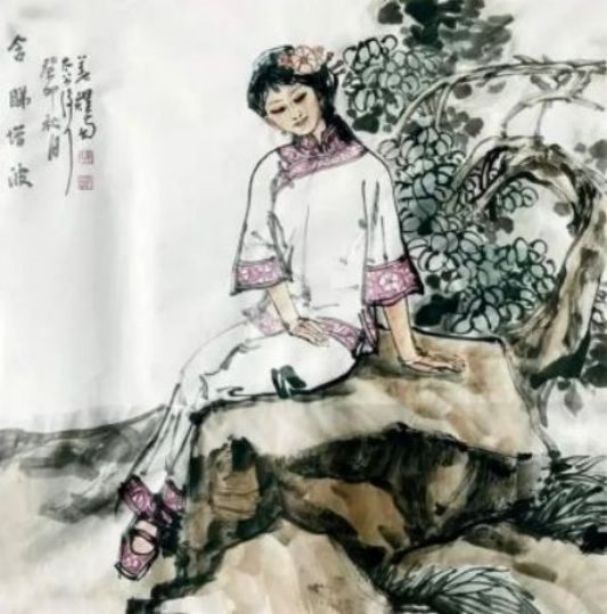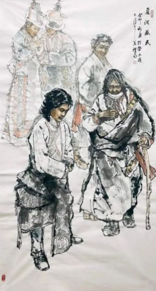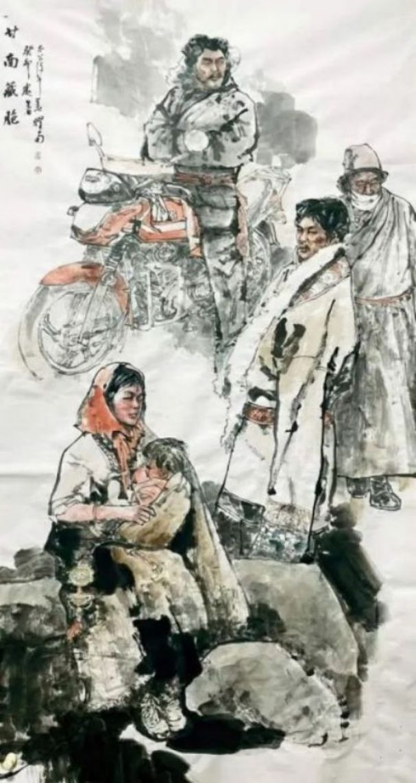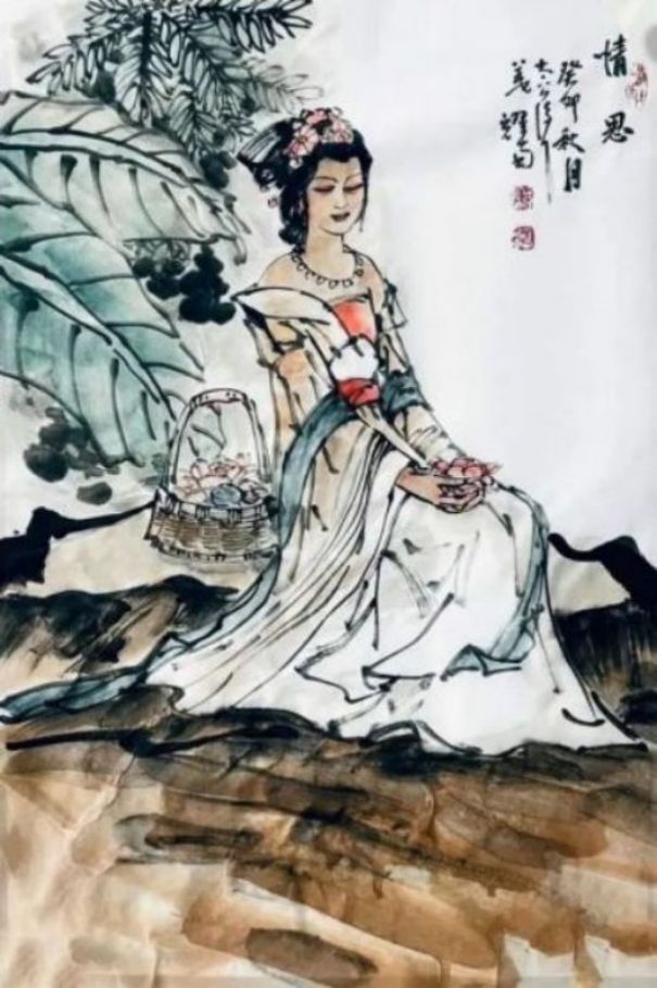 首先在一批描绘藏民的画作中,姜耀南先生就是有采用了一种本土式的特写,只为能够充分表现出独属于藏族人民的地域风格和人文内涵!画面背景没有过多的渲染与衬托,而是以各类人物姿态形成统一的画面结构,人物服饰细节丰富,是谓写意而不失于严谨,或坐或站,或骑车又或哺乳,而这些朴实无华的真实情景描绘,可谓也都是有标志着姜耀南先生对于藏族文化的深刻印象与人文思考。与此同时,传统的仕女形象同样也是姜耀南先生在创作中的一大表现主题,就比如他的一幅《情思》作品,画中仕女温婉有致,浓墨绘其云鬓,艳色染其花饰,见柔情绰态,具秀色玉颜,身着绫罗绸缎坐于石凳,双手端捧花卉,眉眼善睐,端庄大方,观之诚是犹如洛神赋之妙赞,是谓肩若削成,腰如约素,明眸皓齿,气若幽兰也!可以扬绰约之丽姿,更可以怀婉娩之柔情,让人不由心生爱慕!